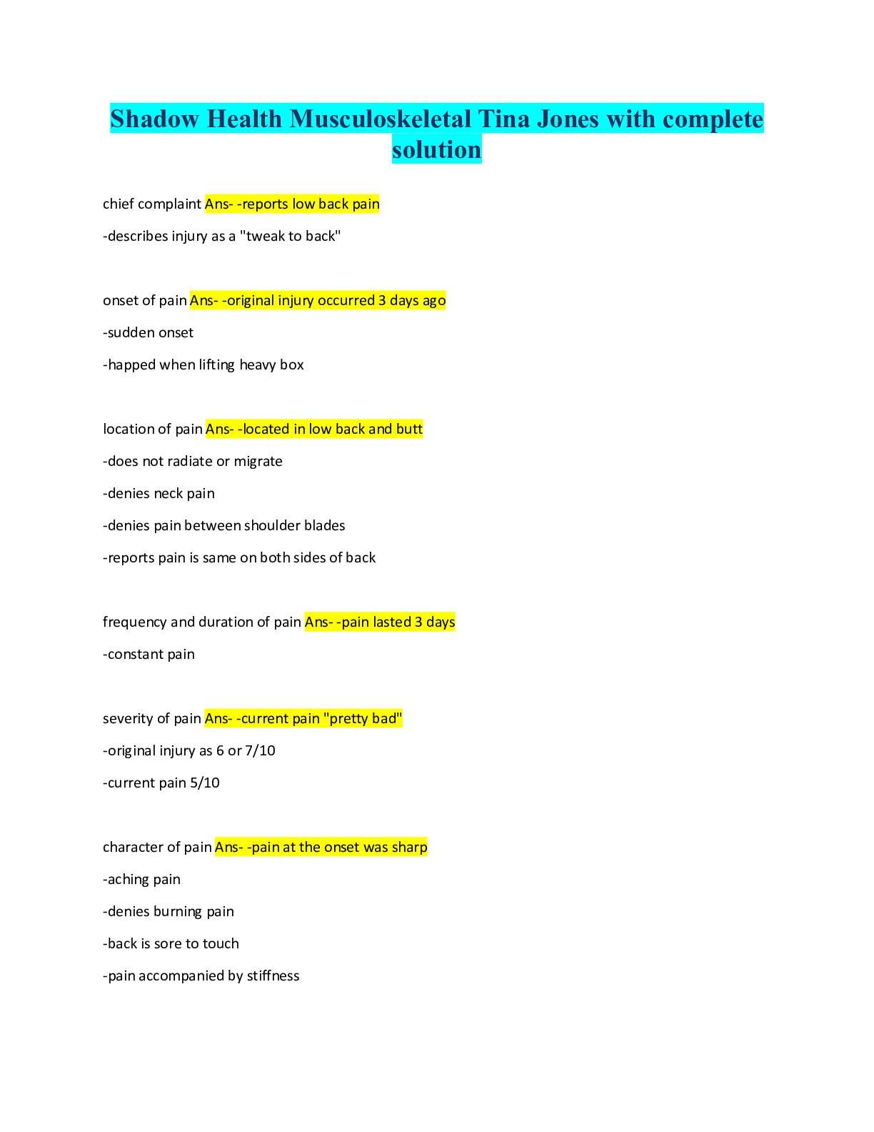 *NURSING > SHADOW HEALTH > Shadow Health Musculoskeletal Tina Jones with complete solution (All)