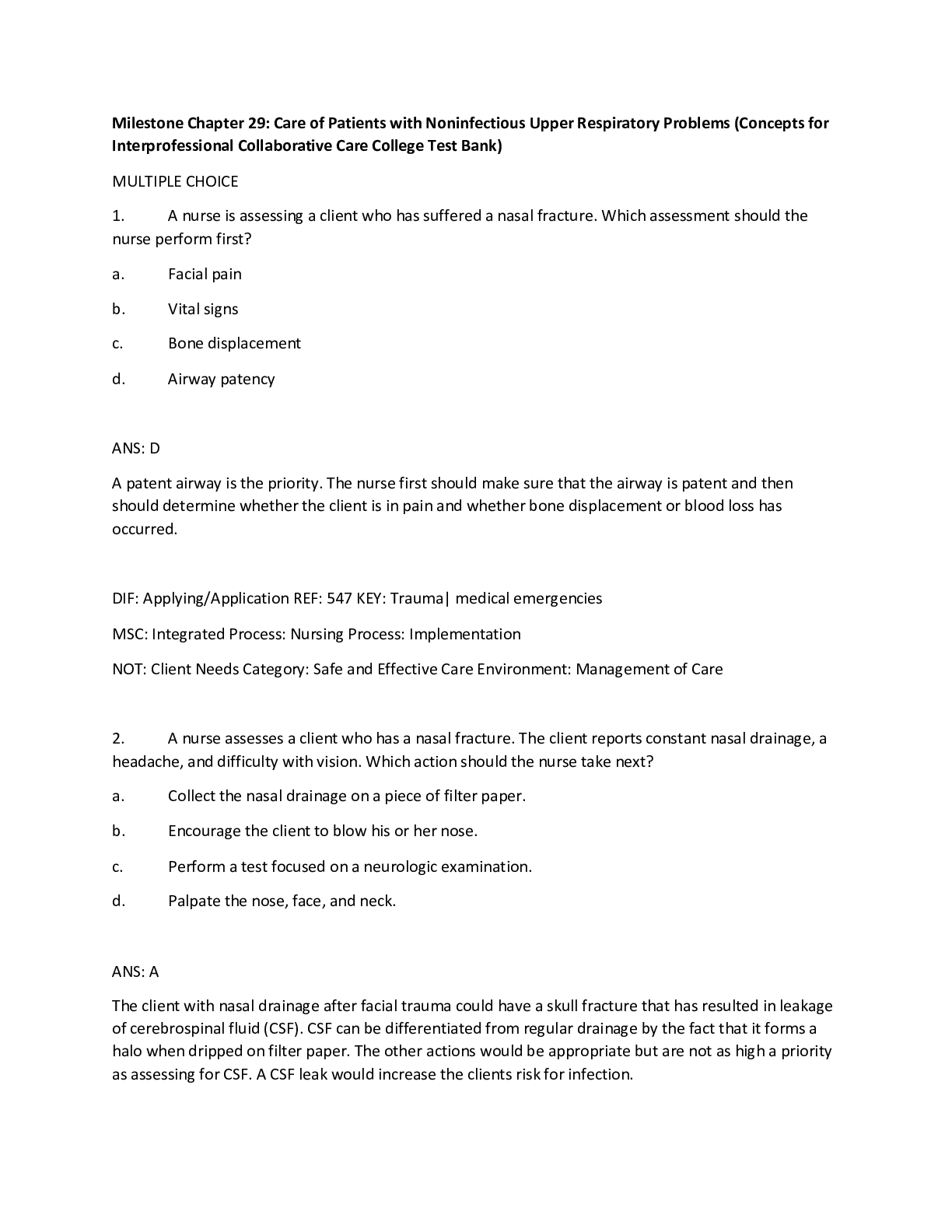 *NURSING > MILESTONE > Milestone Chapter 29 Care of Patients with Noninfectious Upper Respiratory Problems (Concepts for Interprofessional Collaborative Care College Test Bank) (All)