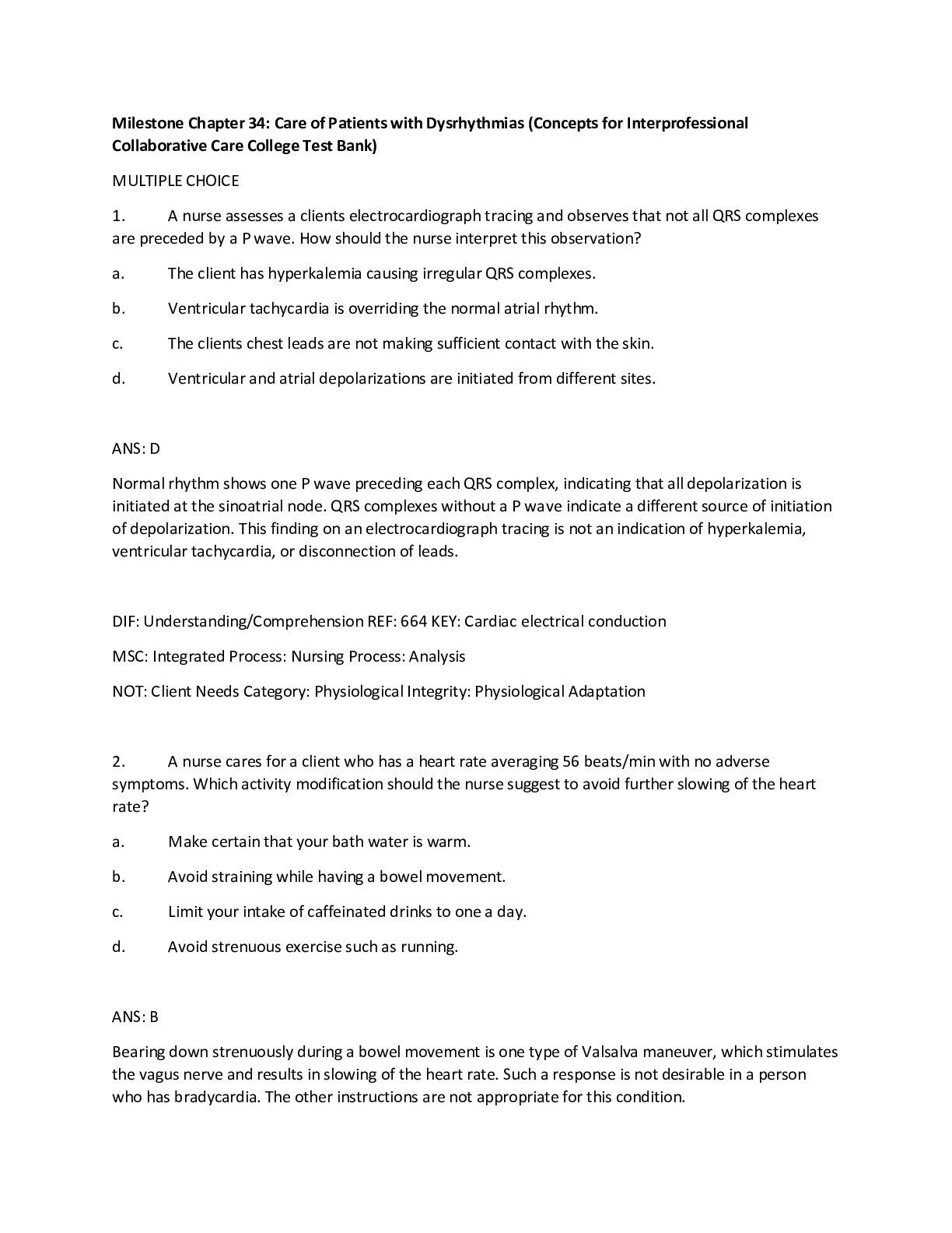 *NURSING > MILESTONE > Milestone Chapter 34 Care of Patients with Dysrhythmias (Concepts for Interprofessional Collaborative Care College Test Bank) (All)