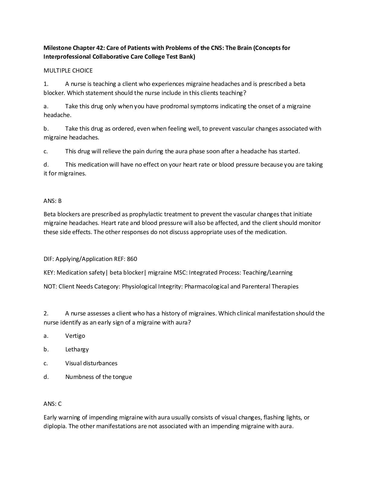 *NURSING > MILESTONE > Milestone Chapter 42 Care of Patients with Problems of the CNS The Brain (Concepts for Interprofessional Collaborative Care College Test Bank) (All)