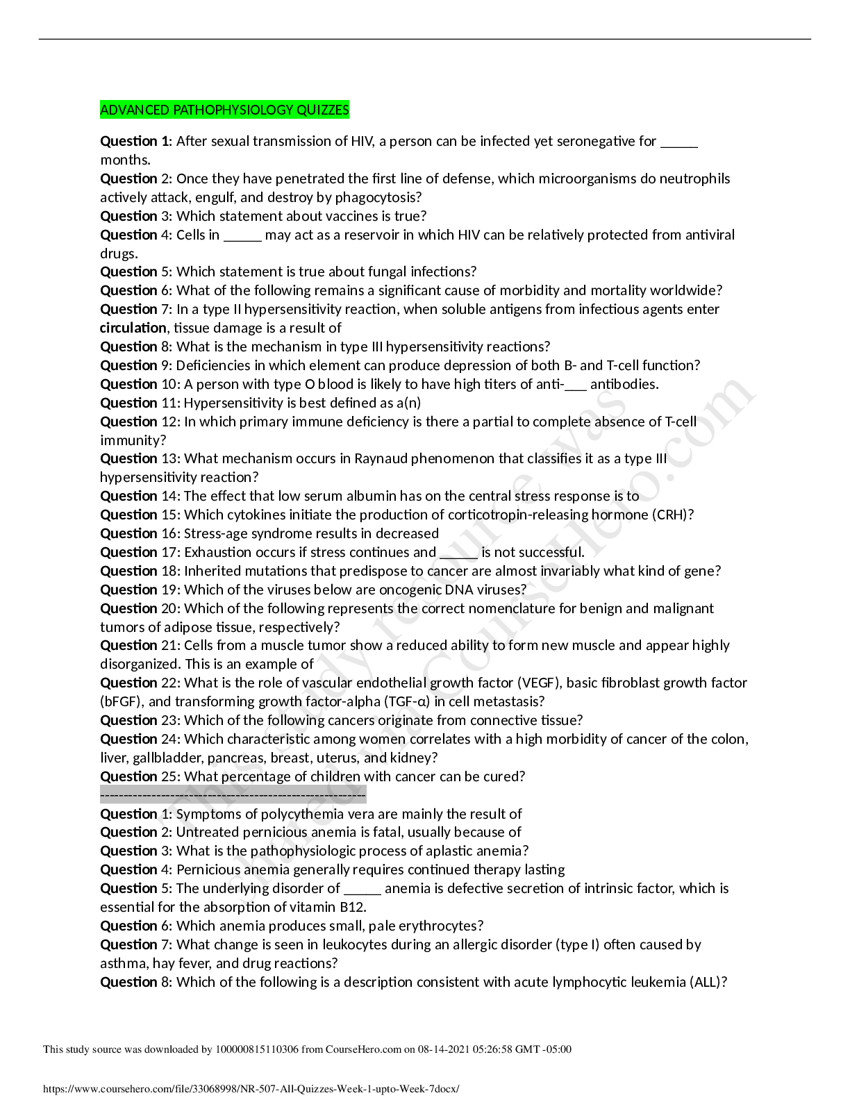 *NURSING > QUESTION PAPER (QP) > NR 507 All Quizzes Week 1 upto Week 7.__ Questions Only (All)