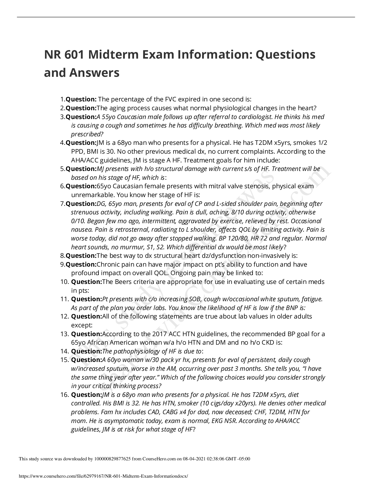 *NURSING > QUESTION PAPER (QP) > NR 601 Midterm Exam Information: Questions Only (All)