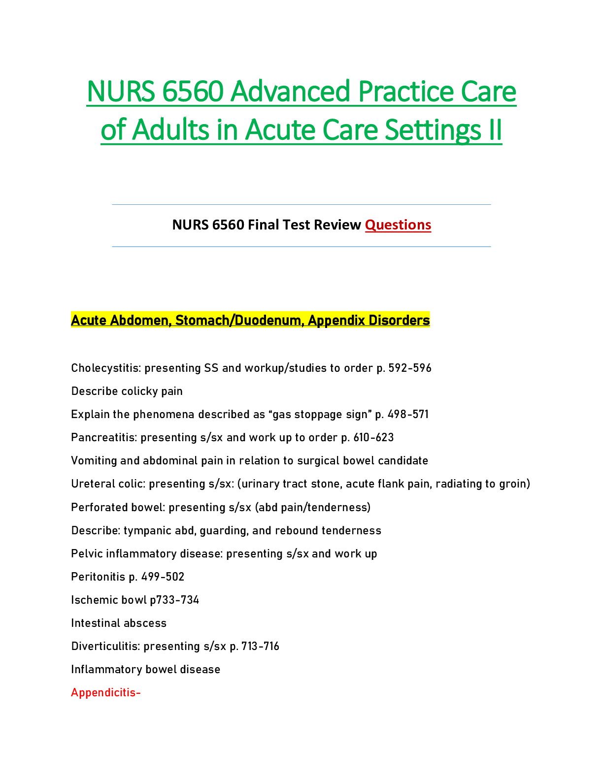 *NURSING > QUESTION PAPER (QP) > NURS6560 / NURS 6560 Final Test Review Questions : Advanced Practice Care of Adults in Acute Care Settings II - Walden (All)