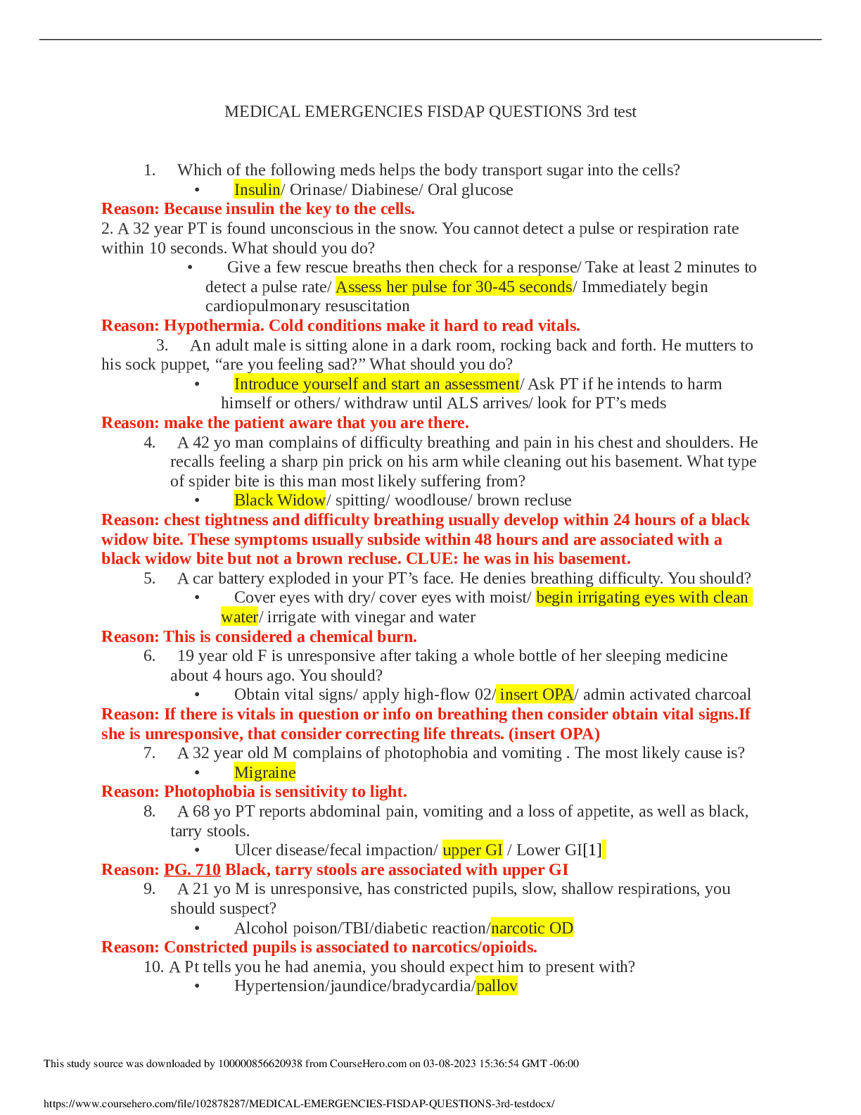 *NURSING > MED-SURG EXAM > MEDICAL EMERGENCIES FISDAP QUESTIONS 3rd test (All)