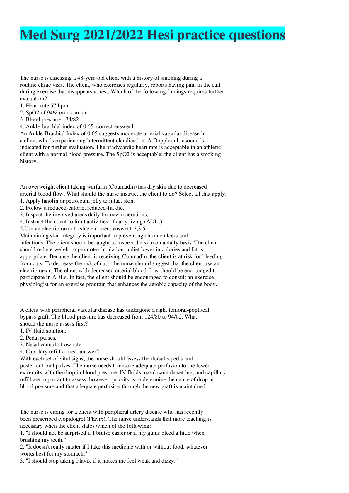 *NURSING > HESI MED SURG > Med Surg Nursing_knowledge_Assessment_Practice_Exam Practice Questions (answered 100% correct) (All)