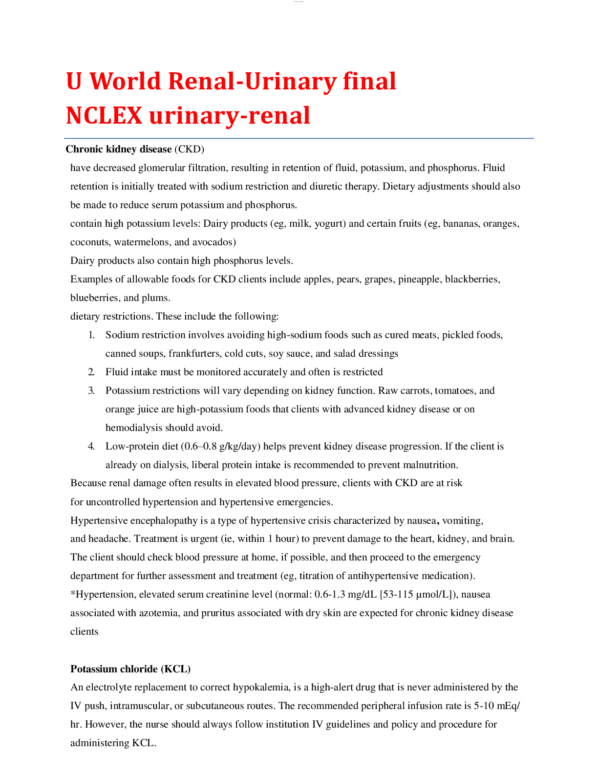 *NURSING > UWorld > U World Renal-Urinary final NCLEX Urinary-Renal. Comprehensive Last Minute Content to Guarantee Passing the UWorld Renal-Urinary Final Exam. (All)