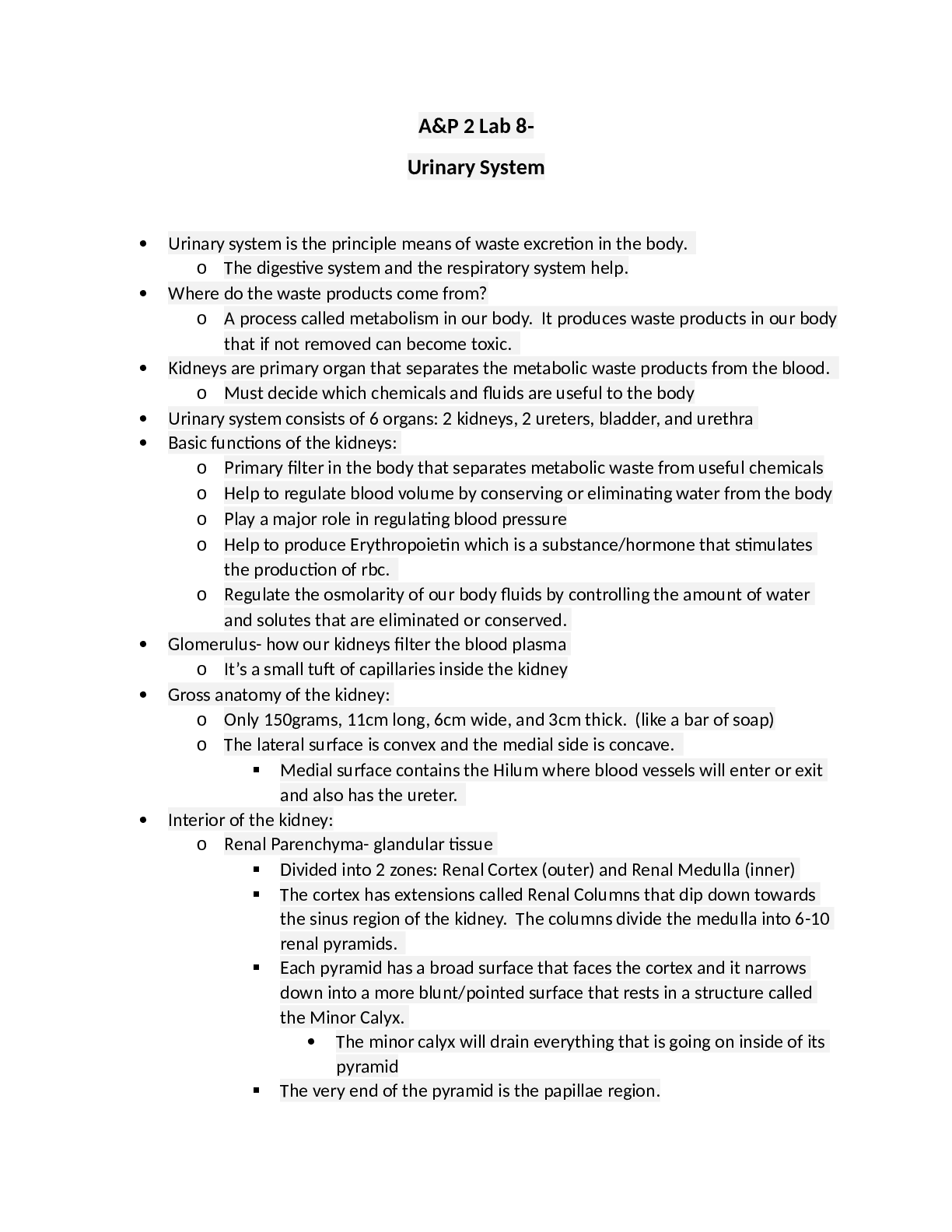 *NURSING > Lab Experiment > BIO202L Lab 14 The Urinary System (All)
