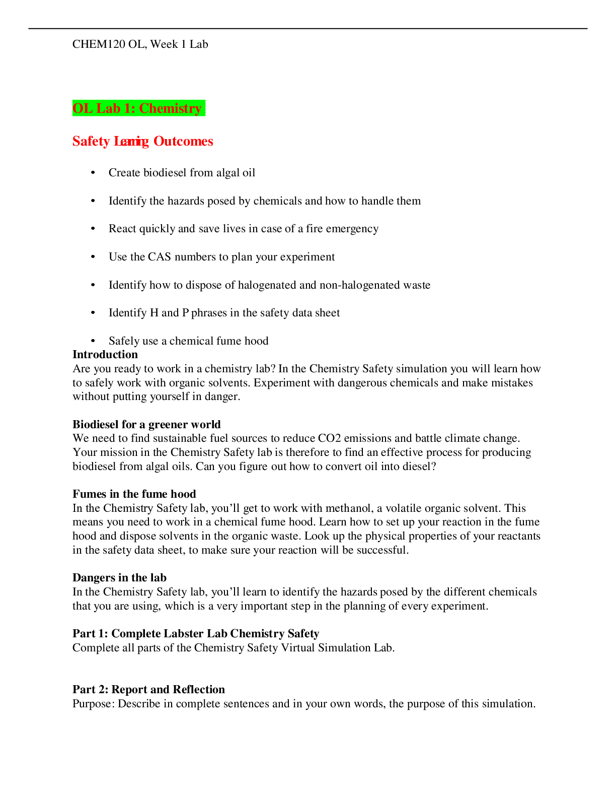 *NURSING > Lab Experiment > OL Lab 1 Chemistry Safety 1 |Elaborated| CHEM-120: Intro to General, Organic & Biological Chemistry with Lab (All)