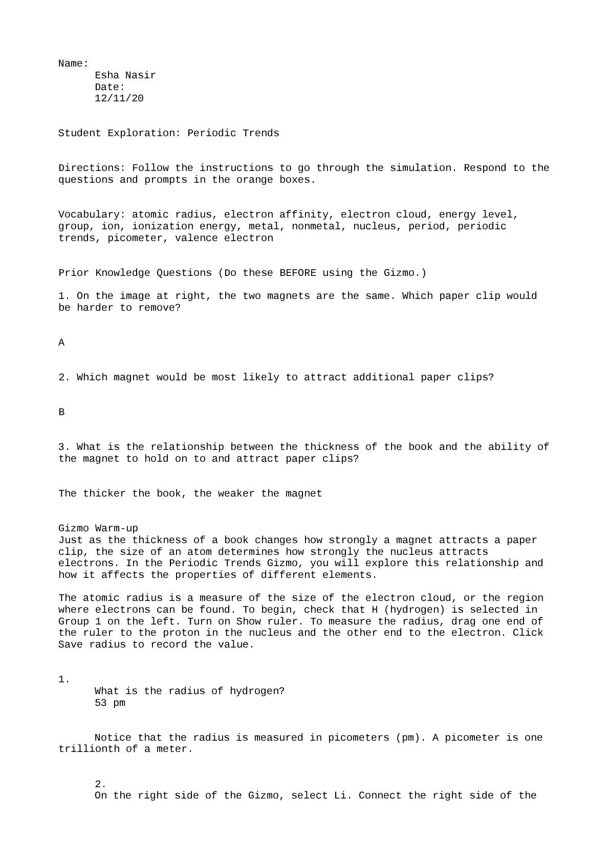 *NURSING > Lab Experiment > Lab Experiment > Student Exploration: Periodic Trends (GIZMOS) (All)