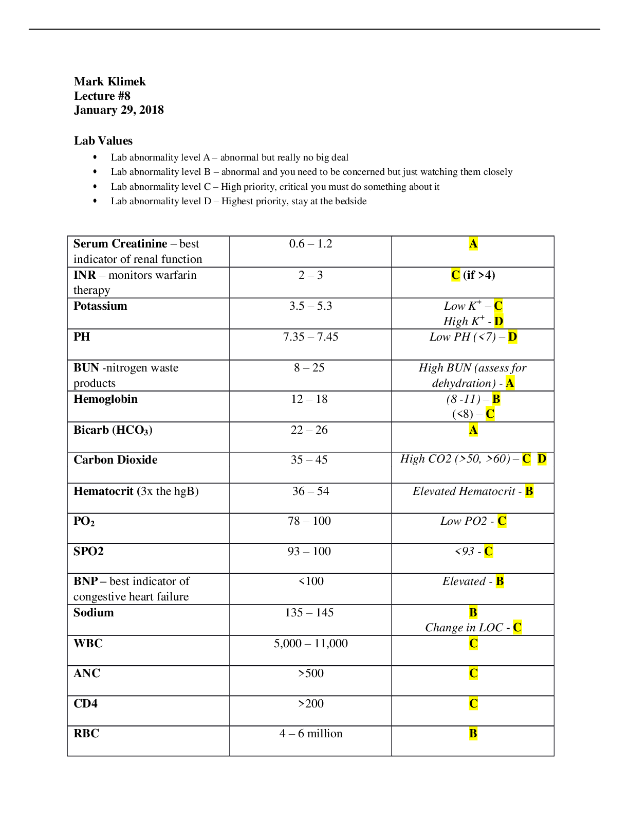 *NURSING > NCLEX > Henry Ford College| NURSING 101| Mark Klimek's Lecture 8 Notes| NCLEX Lab Values (All)