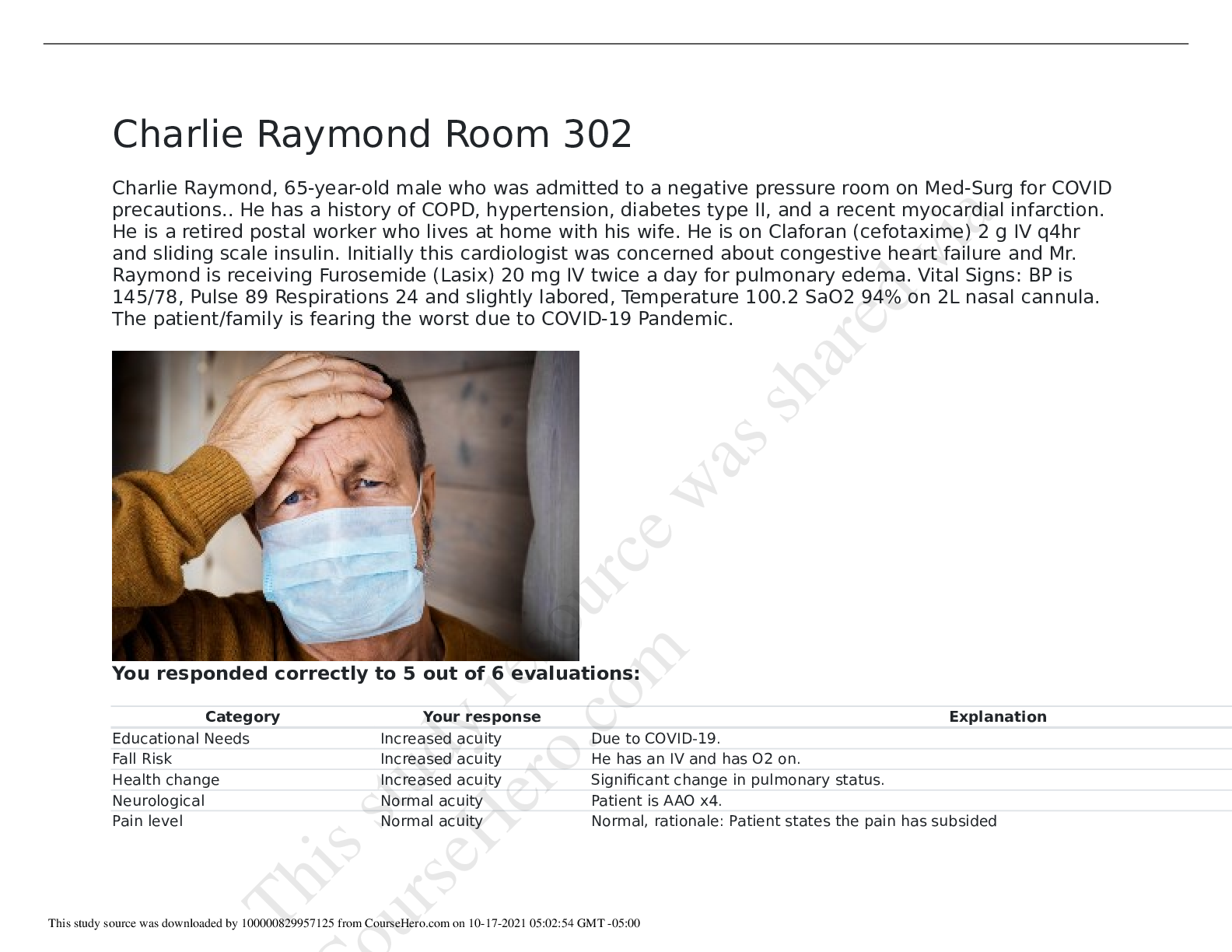 *NURSING > CASE STUDY > NUR 3330 Charlie Raymond Room 302 Med-Surg (ALL EVALUATIONS) (All)