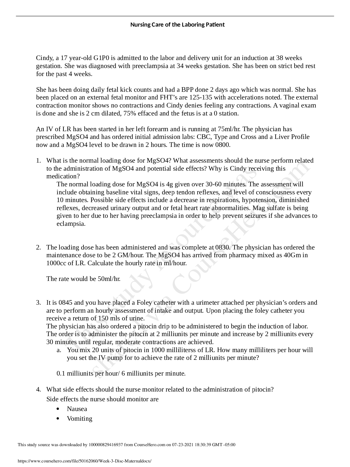 *NURSING > CASE STUDY > Week 3 Disc Maternal_Nursing Care of the Laboring Patient_Cindy (All)