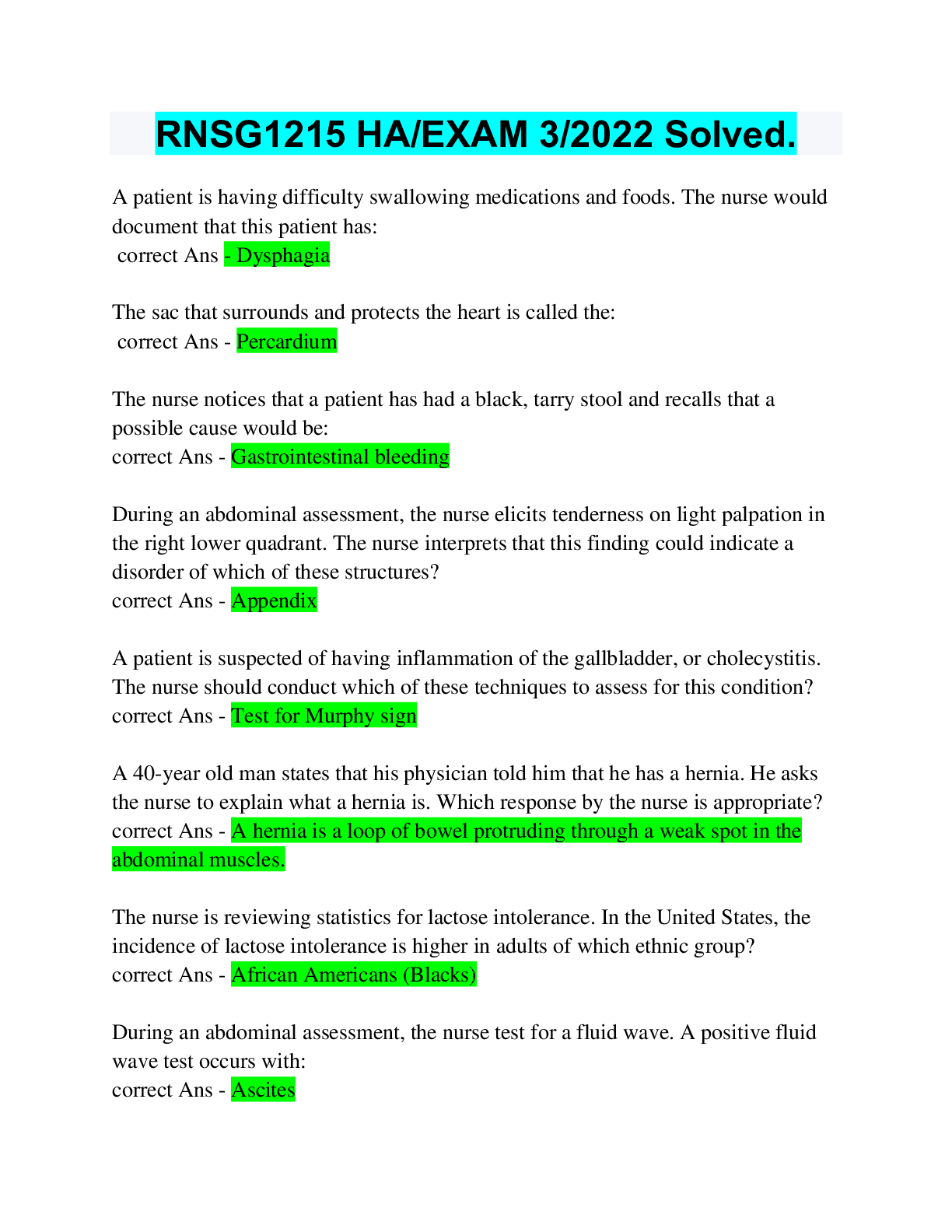 *NURSING > AQA > RNSG1215 HA/EXAM 3/2022 Solved / RNSG 1215 Health Assessment Exam 3 Answered Spring 2022. (All)