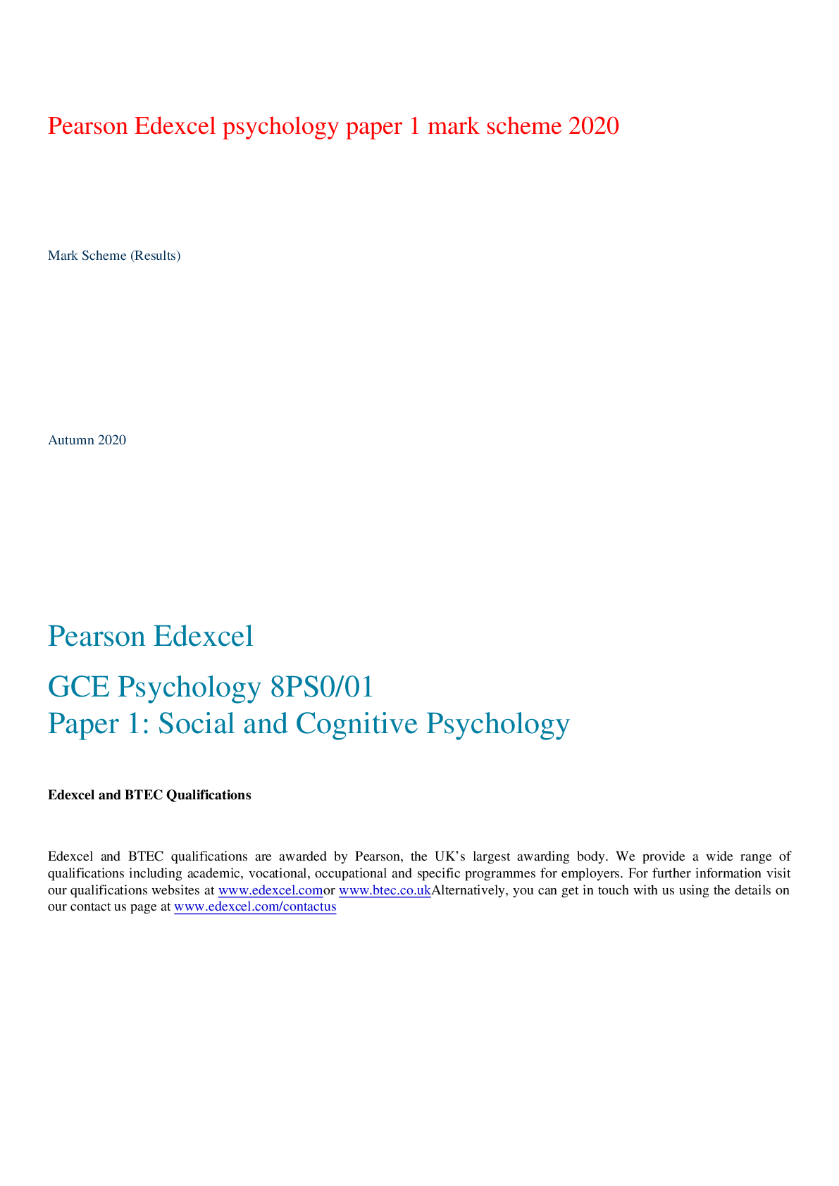 *NURSING > A/As Level Mark Scheme > Pearson Edexcel psychology paper 1 mark scheme 2020,100% CORRECT (All)