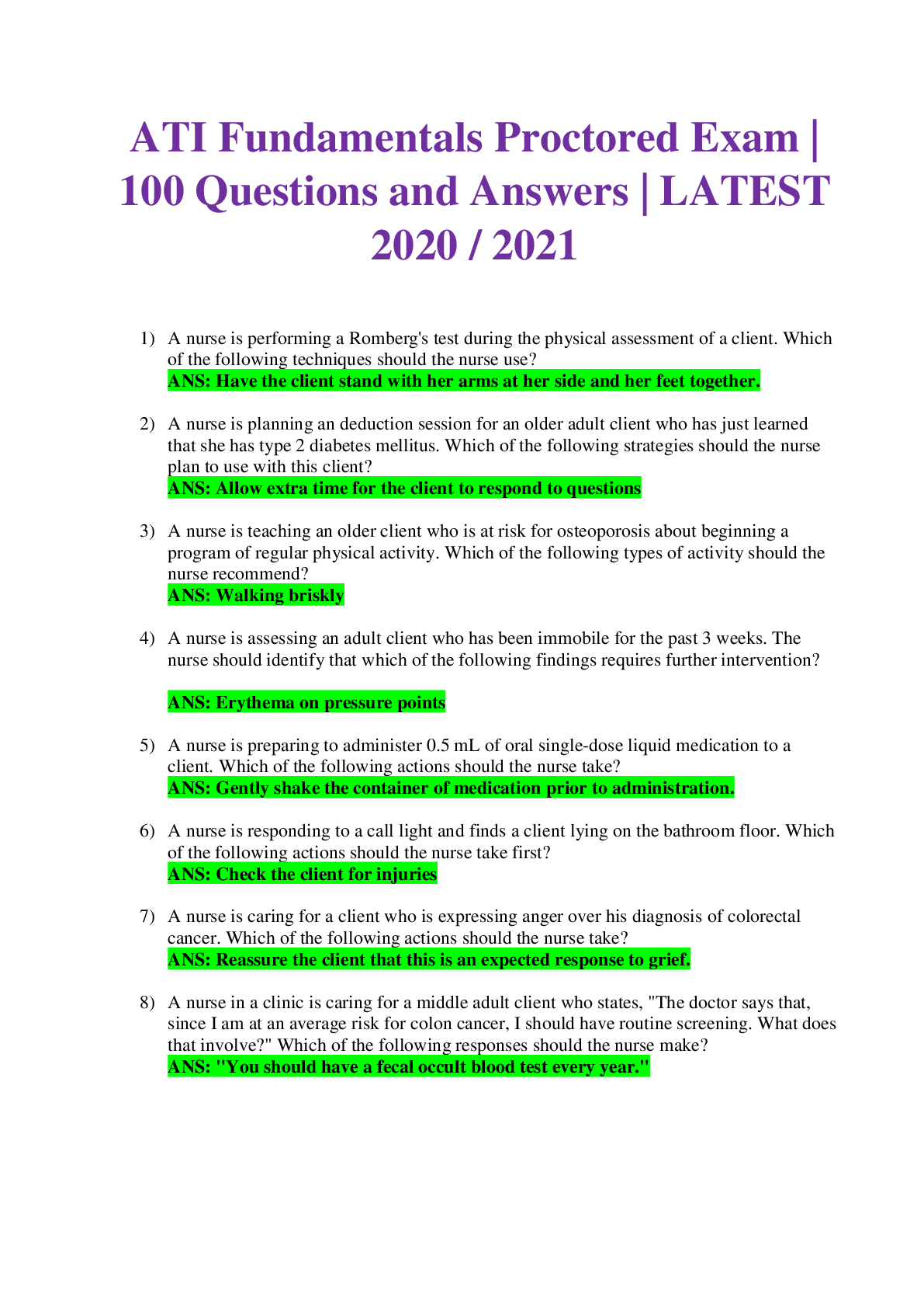 *NURSING > QUESTION PAPER & MARK SCHEME > ATI RN FUNDAMENTALS PROCTORED EXAM 22 VERSIONS QUESTIONS AND ANSWERS LATEST REVIEW (All)