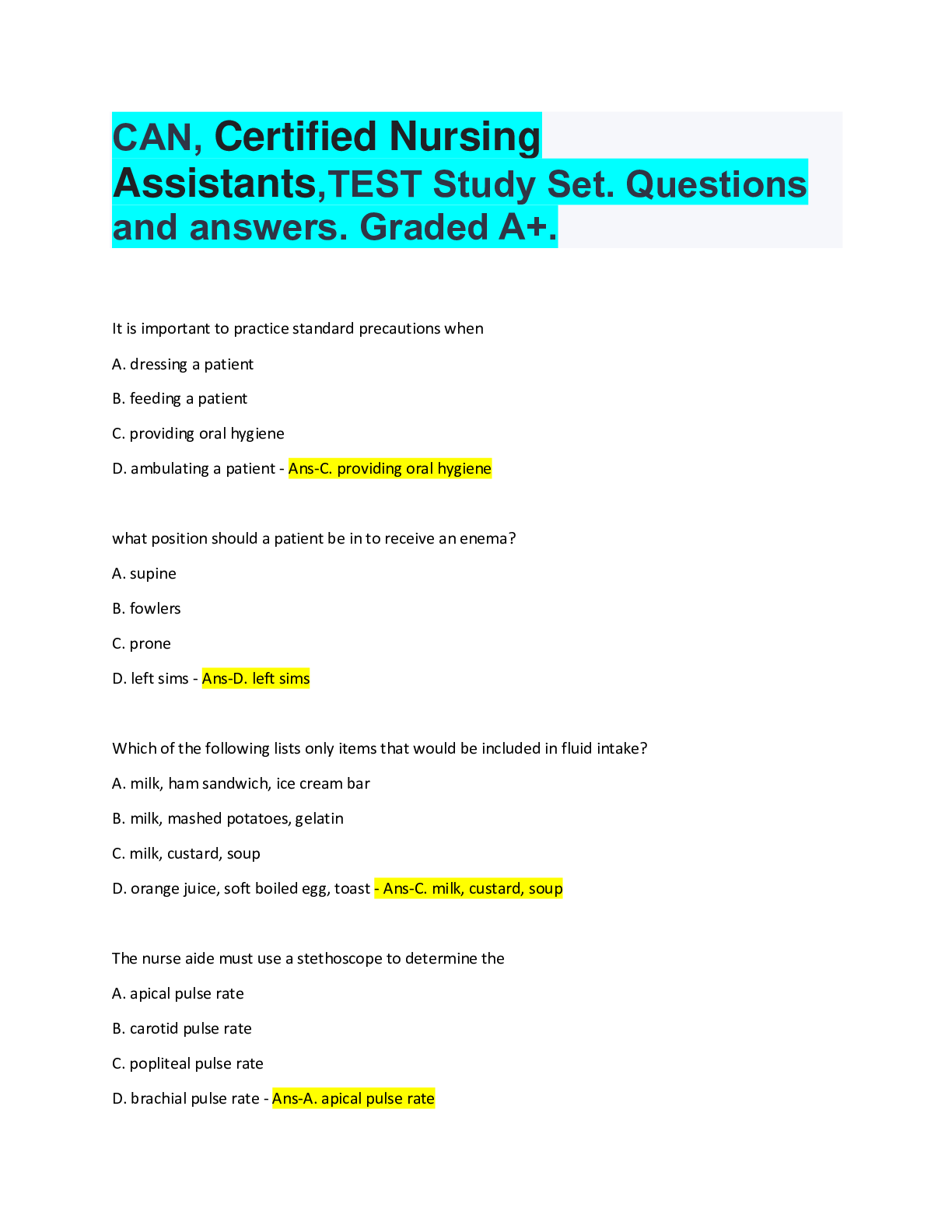 *NURSING > QUESTION PAPER & MARK SCHEME > CAN, Certified Nursing Assistants,TEST Study Set. Questions and answers. Graded A+. (All)