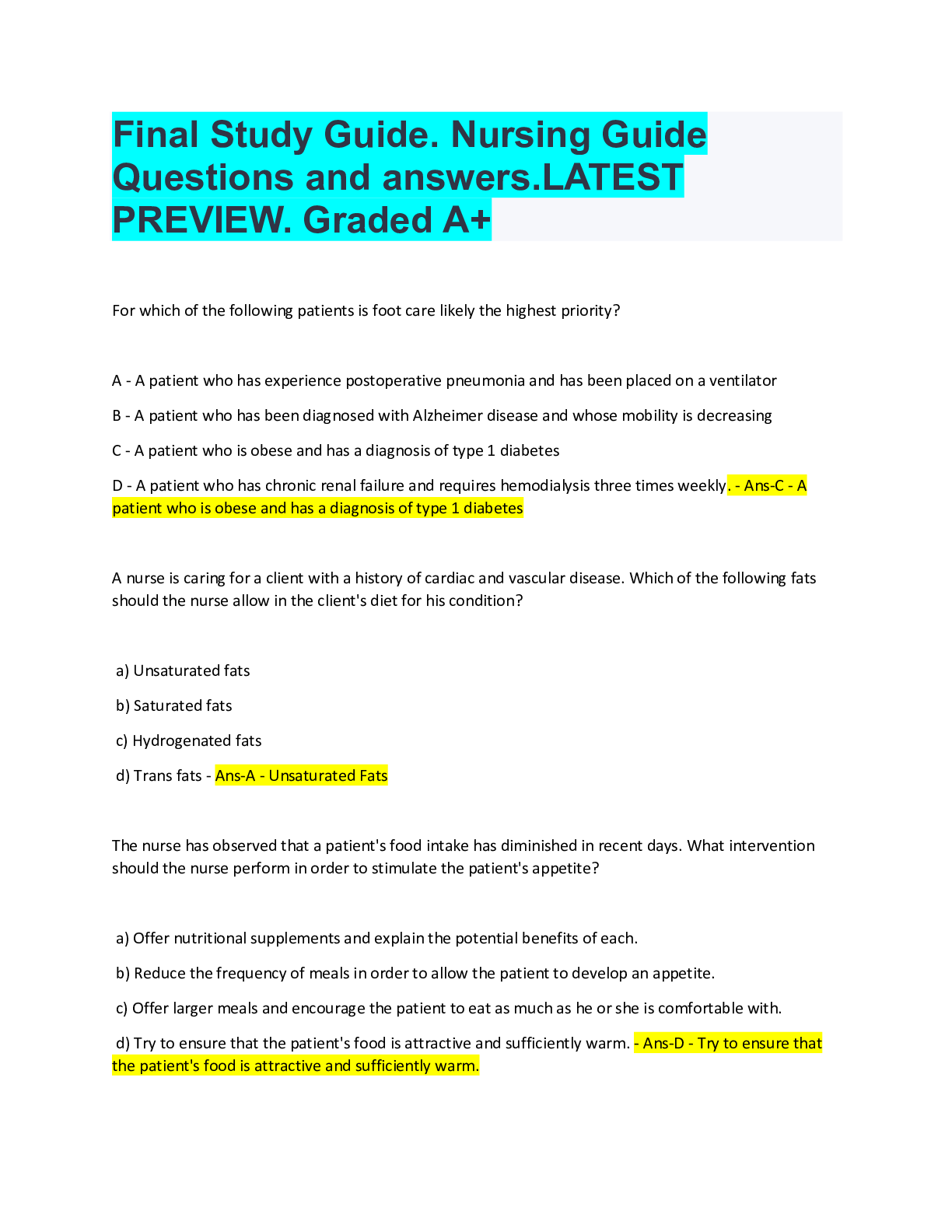 *NURSING > QUESTION PAPER & MARK SCHEME > Final Study Guide. Nursing Guide Questions and answers.LATEST PREVIEW. Graded A+ (All)