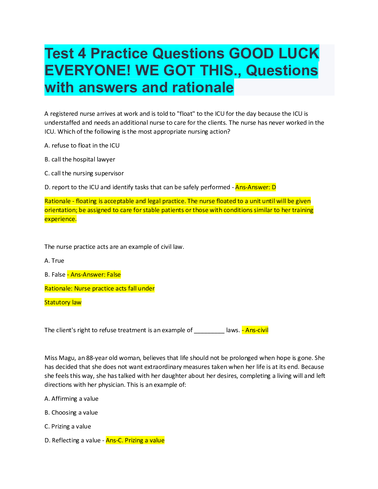 *NURSING > QUESTION PAPER & MARK SCHEME > Test 4 Practice Questions GOOD LUCK EVERYONE! WE GOT THIS., Questions with answers and rationale (All)