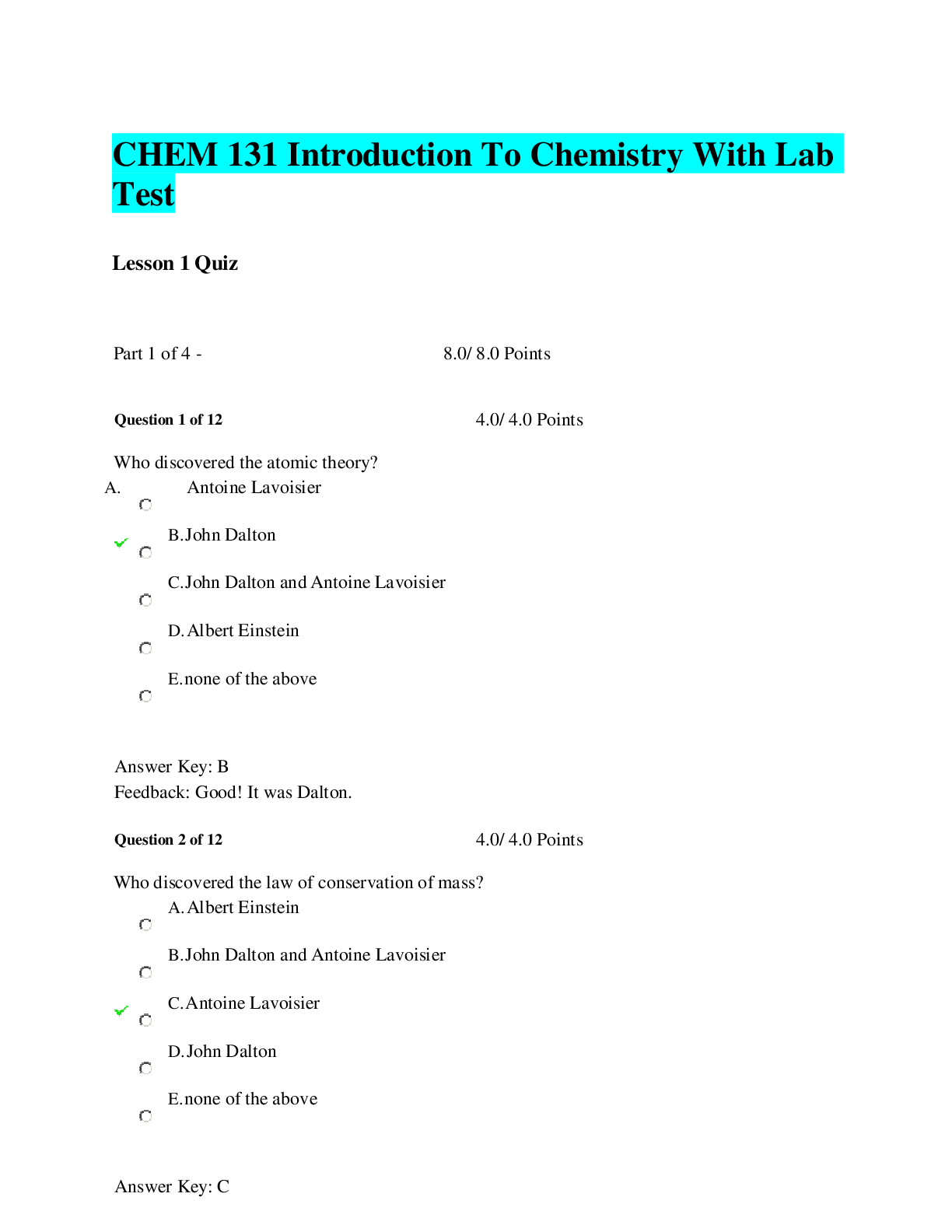 *NURSING > EXAM > CHEM 131 Introduction To Chemistry With Lab Test (Questions And Answers). (All)