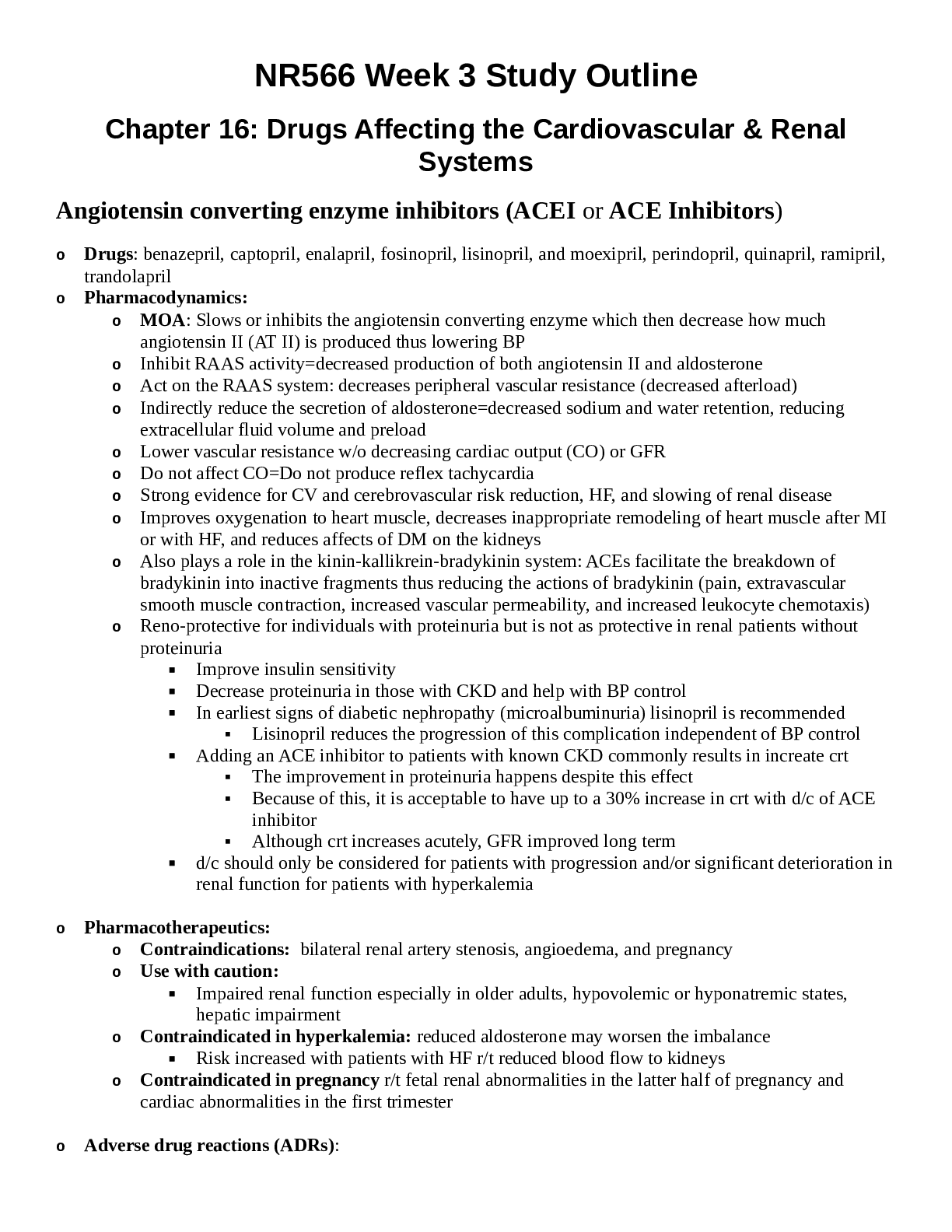 *NURSING > STUDY GUIDE > NR 566 Week 3 Study Guide {2022} | Chapter 16: Drugs Affecting the Cardiovascular & Renal Systems Angiotensin converting enzyme inhibitors (ACEI or ACE Inhibitors) (All)