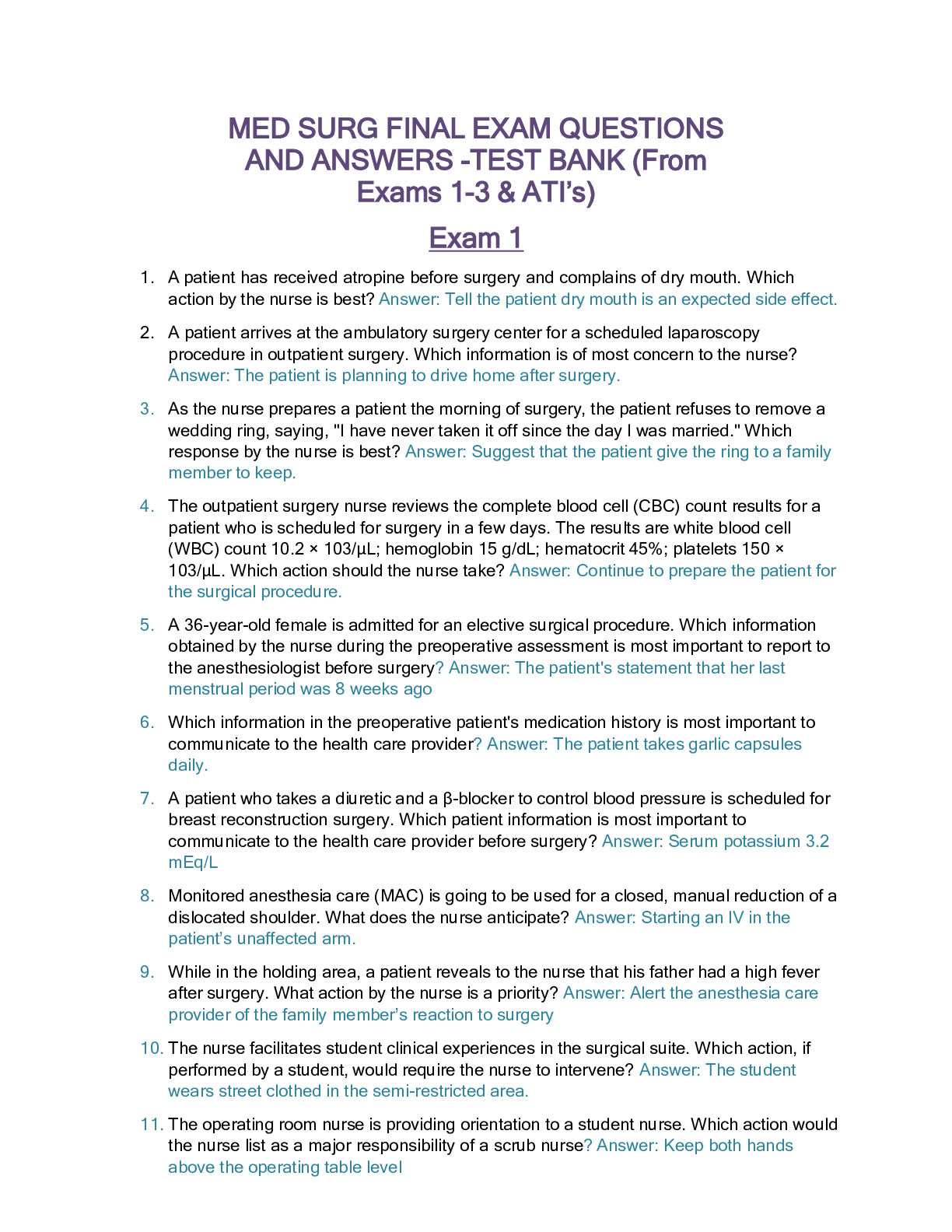 *NURSING > QUESTIONS & ANSWERS > MED SURG FINAL EXAM QUESTIONS AND ANSWERS -TEST BANK (From Exams 1-3 & ATI’s) Exam 1 (All)