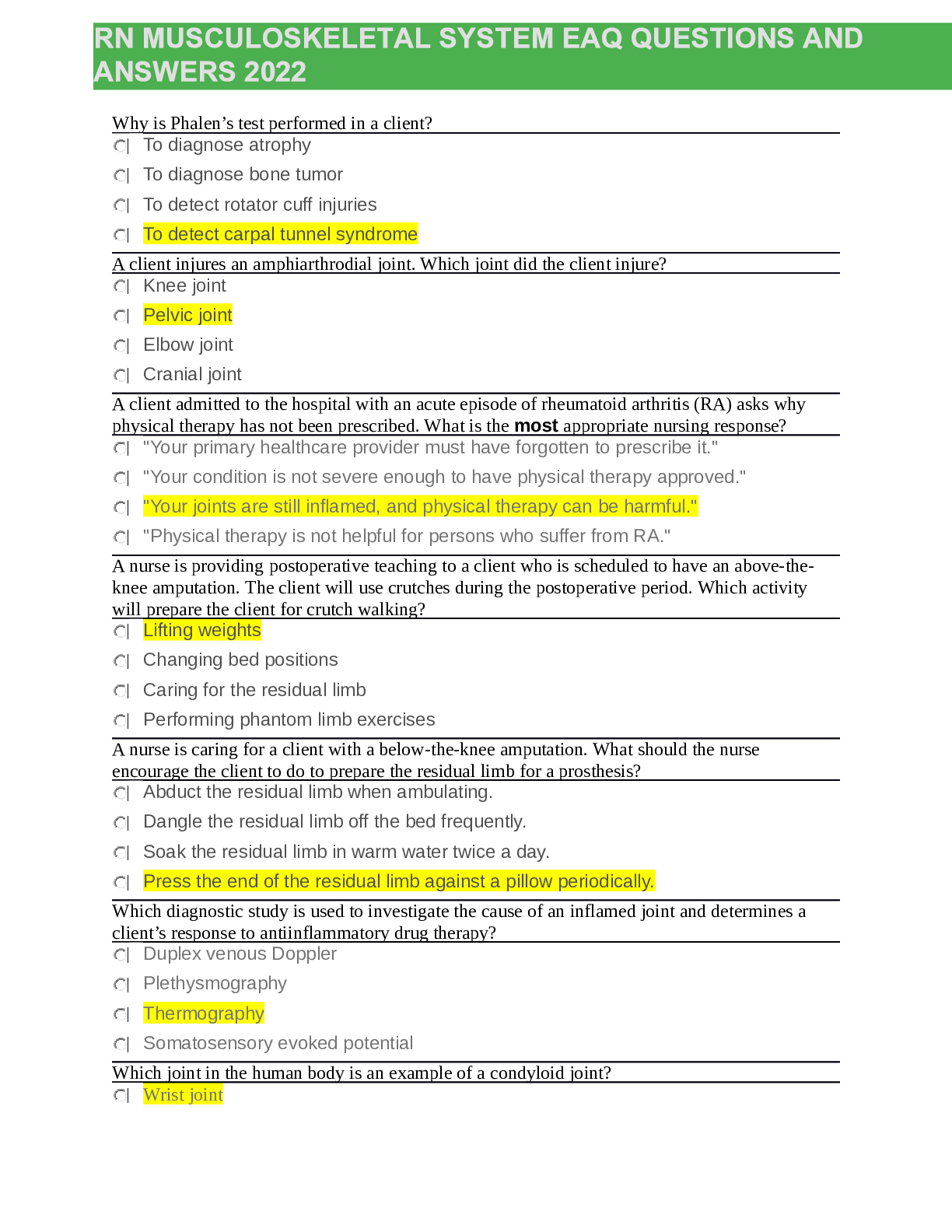 *NURSING > QUESTIONS & ANSWERS > RN MUSCULOSKELETAL SYSTEM EAQ QUESTIONS AND ANSWERS 2022 (All)