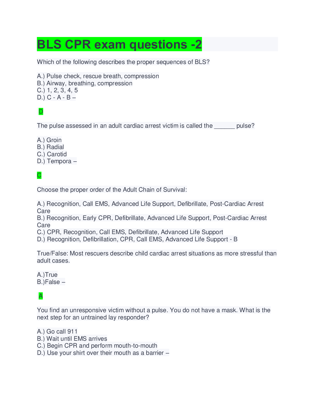 *NURSING > EXAM > BLS CPR Exam Questions And Answers -2( Complete Solution)TOP NOTCH A+ (All)