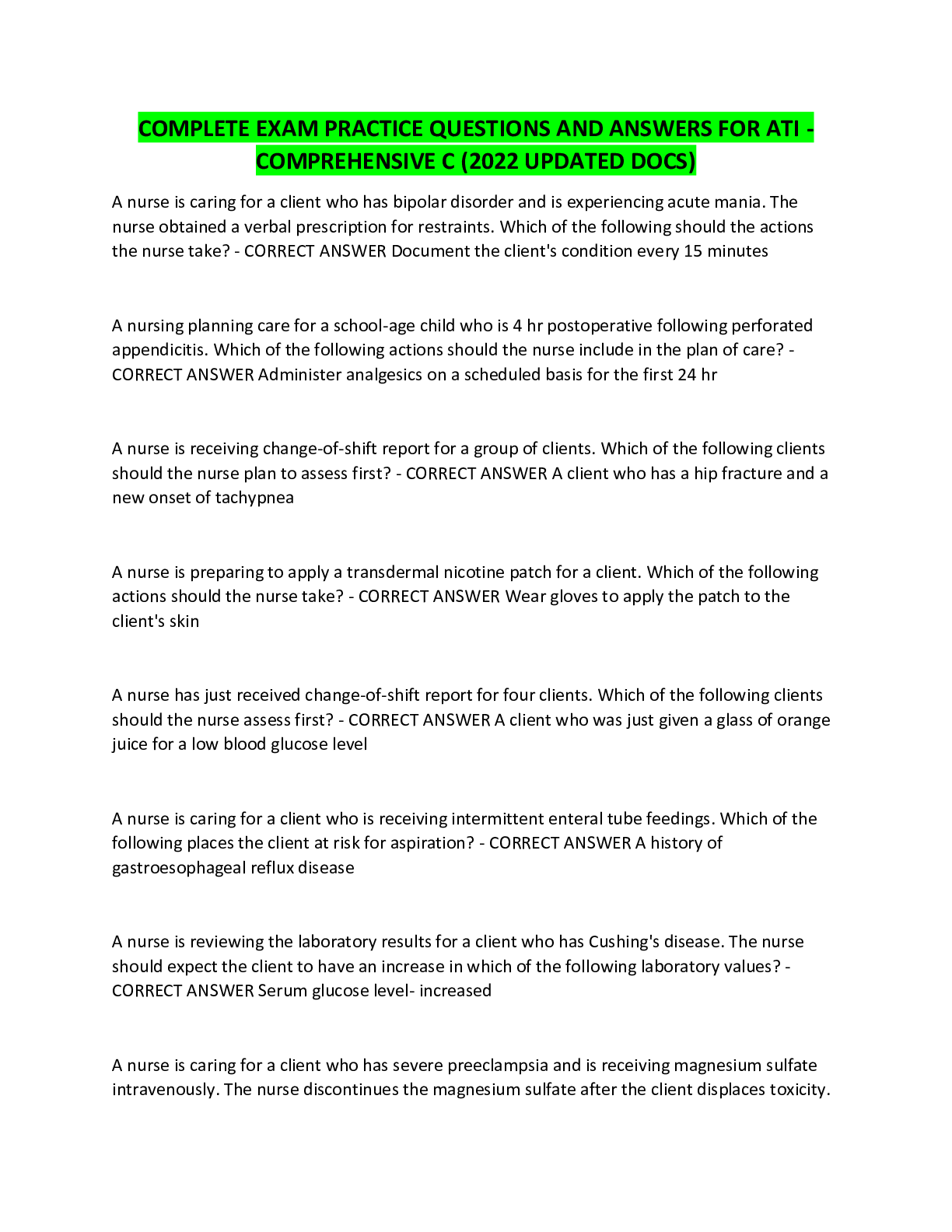*NURSING > EXAM > COMPLETE EXAM PRACTICE QUESTIONS AND ANSWERS FOR ATI - COMPREHENSIVE C (2022 UPDATED DOCS) (All)