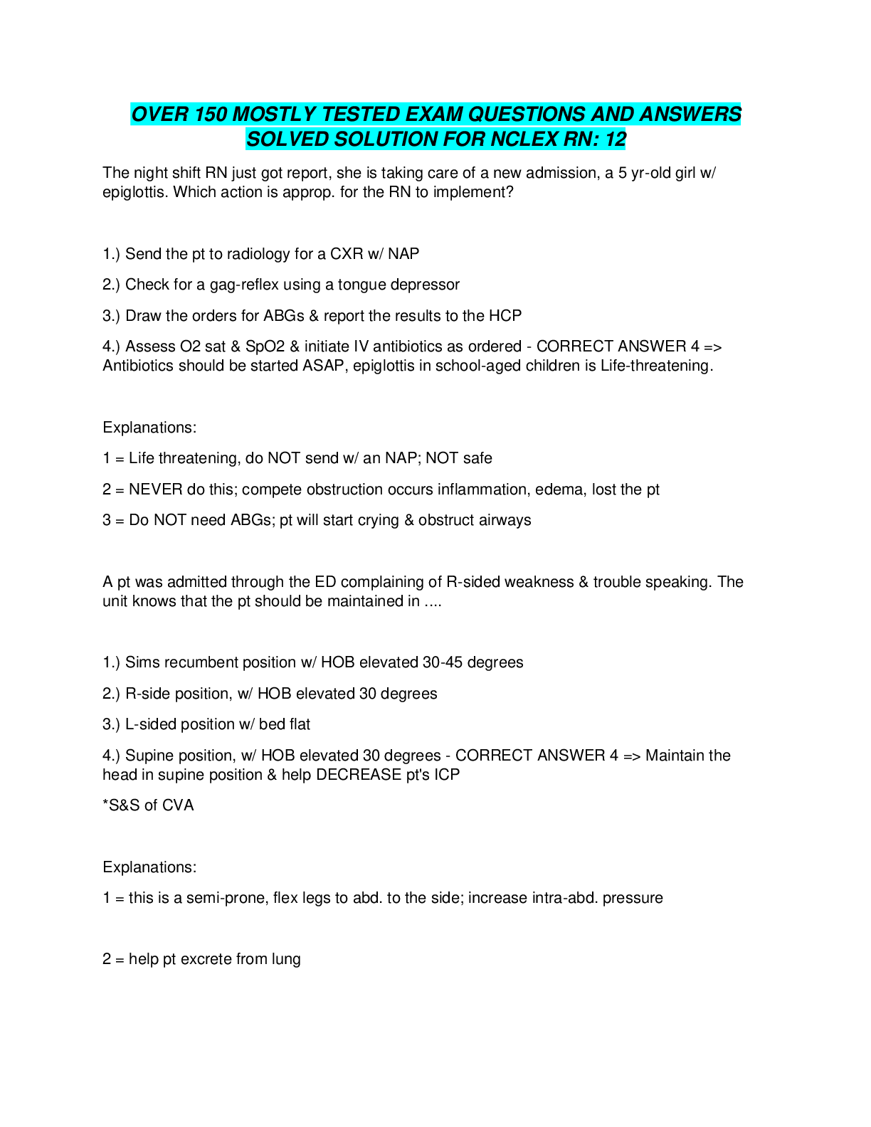 *NURSING > EXAM > OVER 150 MOSTLY TESTED EXAM QUESTIONS AND ANSWERS SOLVED SOLUTION FOR NCLEX RN: 12 (All)