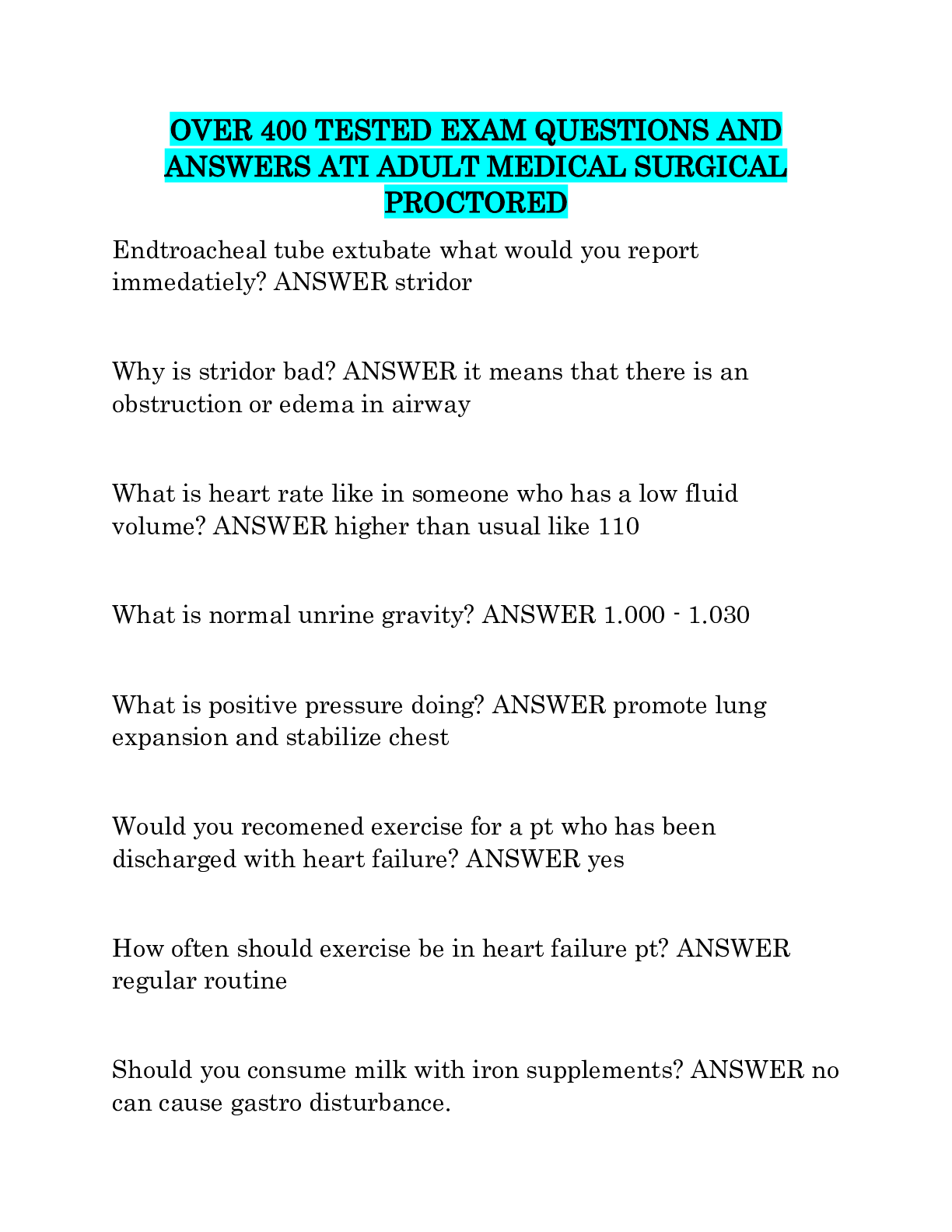 *NURSING > EXAM > OVER 400 TESTED EXAM QUESTIONS AND ANSWERS ATI ADULT MEDICAL SURGICAL PROCTORED (All)