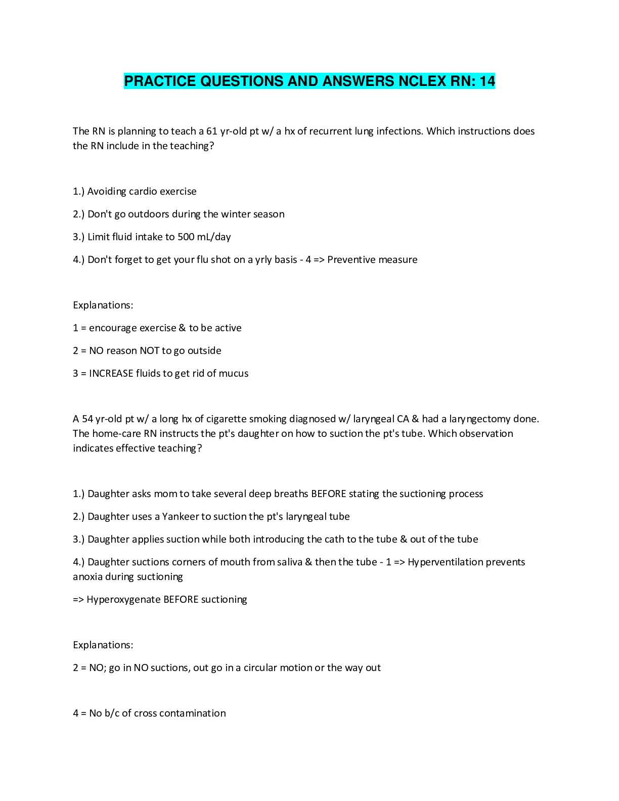 *NURSING > EXAM > PRACTICE QUESTIONS AND ANSWERS NCLEX RN: 14 (All)