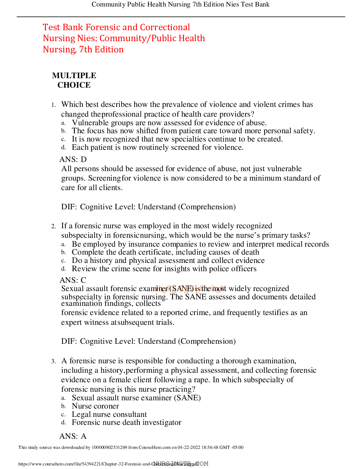 *NURSING > QUESTIONS & ANSWERS > Test Bank Forensic and Correctional Nursing Nies: Community/Public Health Nursing, 7th Edition (All)