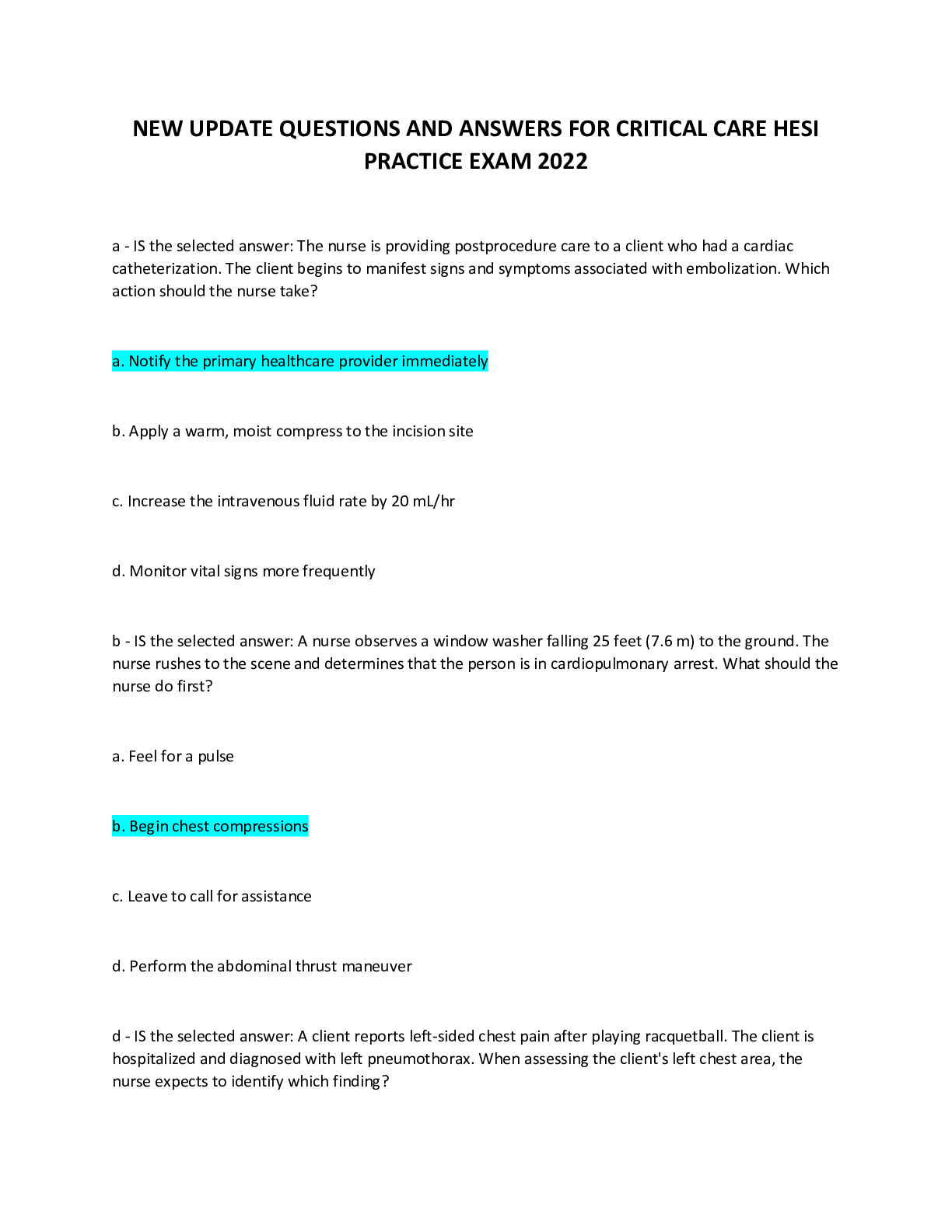 *NURSING > EXAM > NEW UPDATE QUESTIONS AND ANSWERS FOR CRITICAL CARE HESI PRACTICE EXAM 2022 (All)