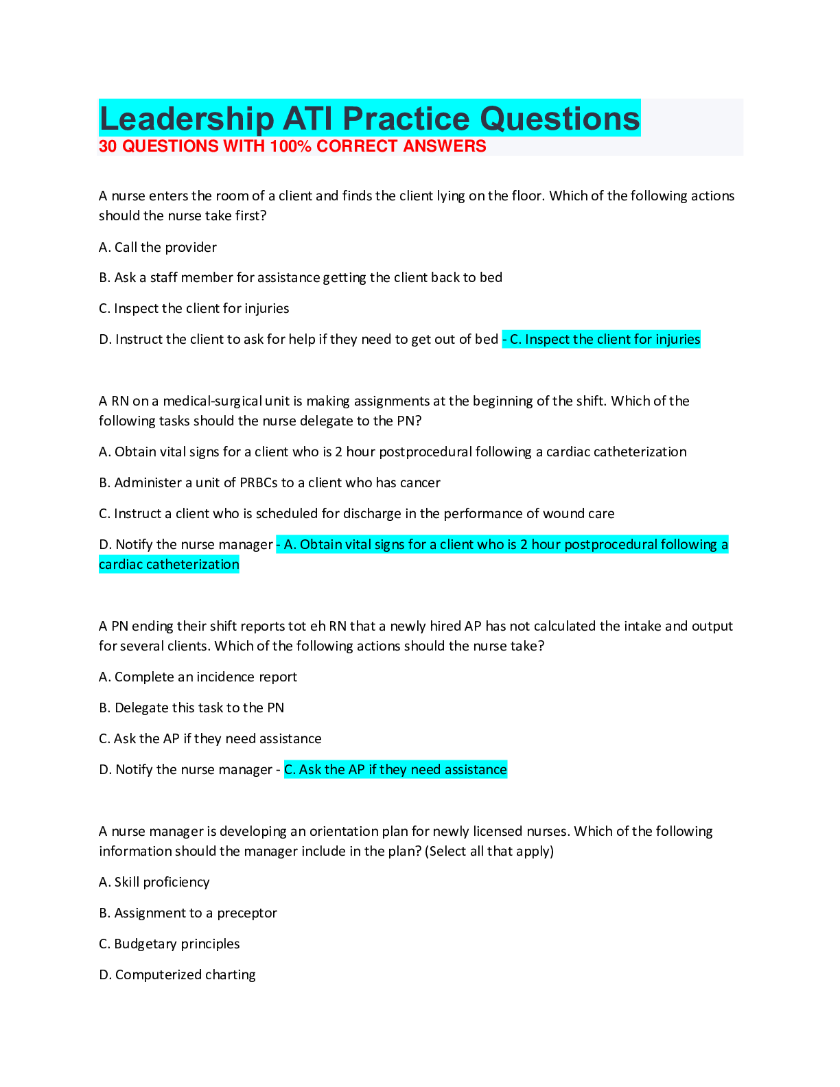*NURSING > ATI > Leadership ATI Practice Questions 30 QUESTIONS WITH 100% CORRECT ANSWERS (All)