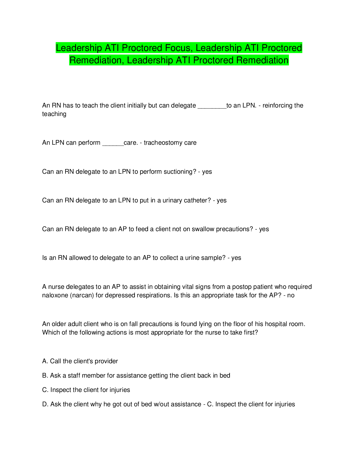*NURSING > EXAM REVIEW > Leadership ATI review 117 Questions with 100% Correct Answers (All)