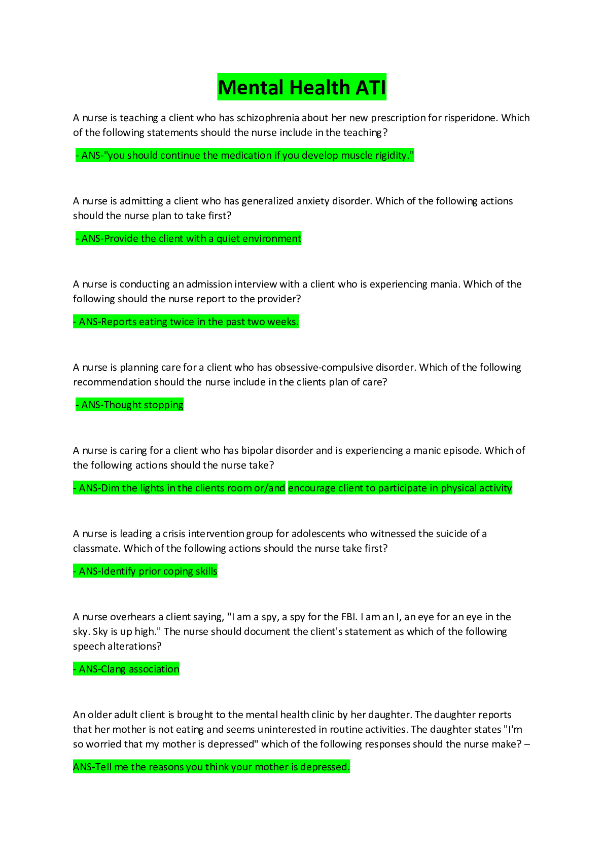 *NURSING > ATI > Mental Health ATI - Assessment A 2022 60 Questions & Answers (All)
