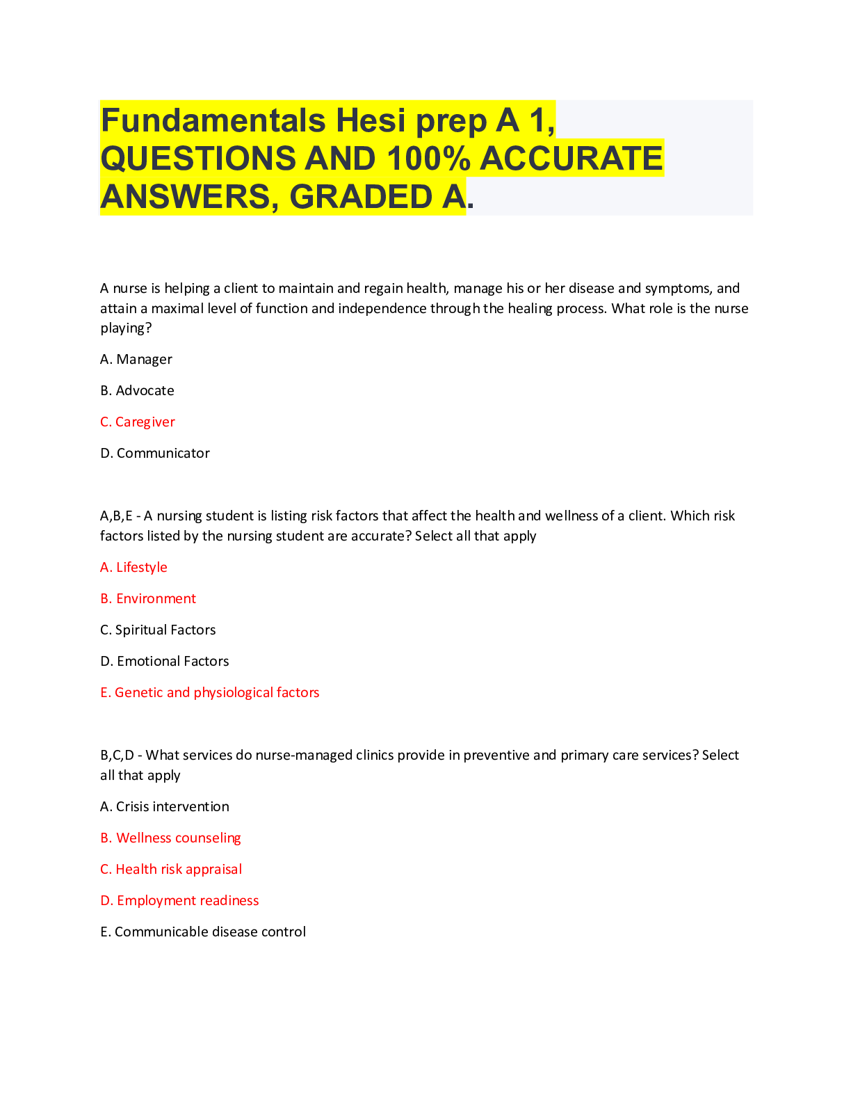 *NURSING > HESI > Fundamentals Hesi prep A 1, QUESTIONS AND 100% ACCURATE ANSWERS, GRADED A. (All)