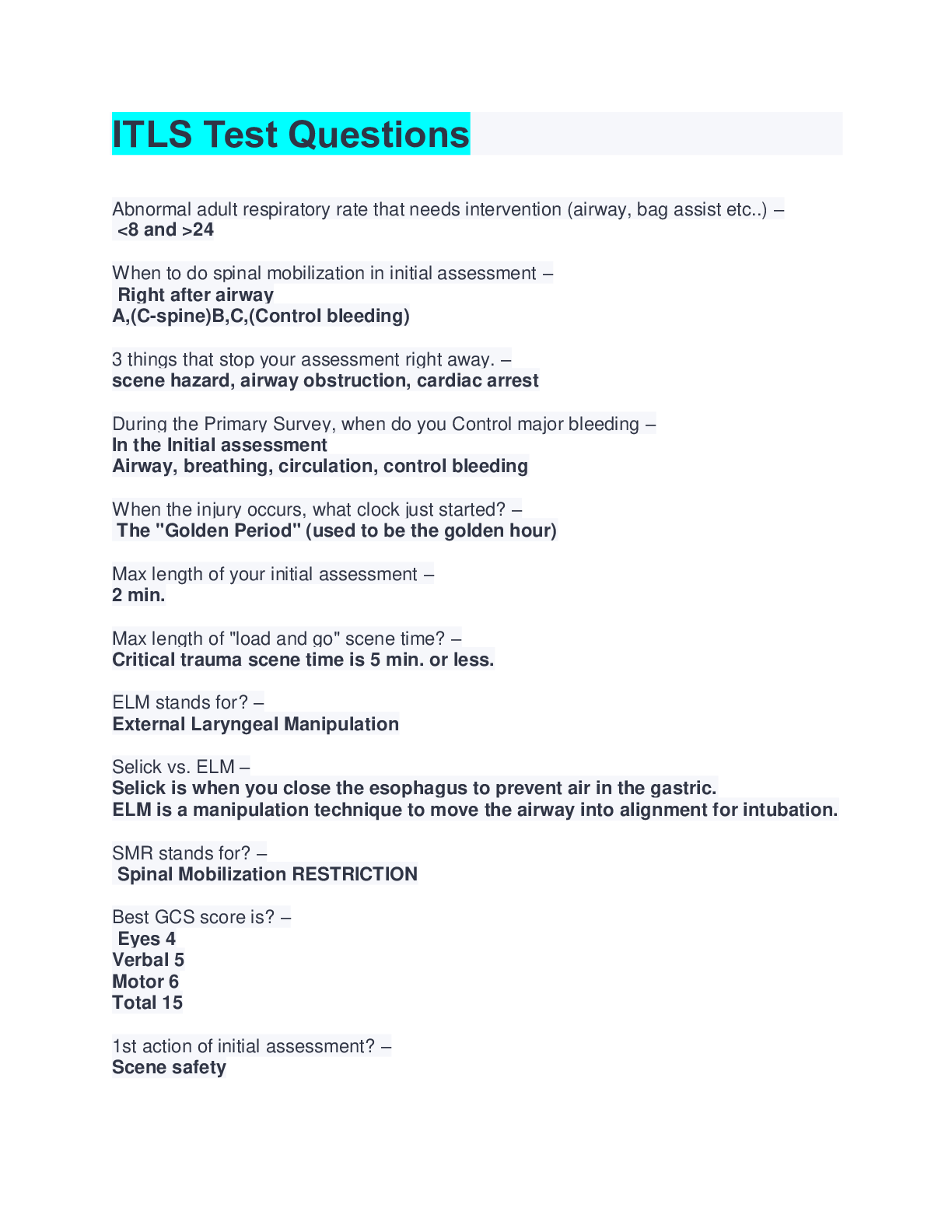 *NURSING > EXAM > ITLS Test Questions And Answers( With Complete Top Solution Rated A+) (All)