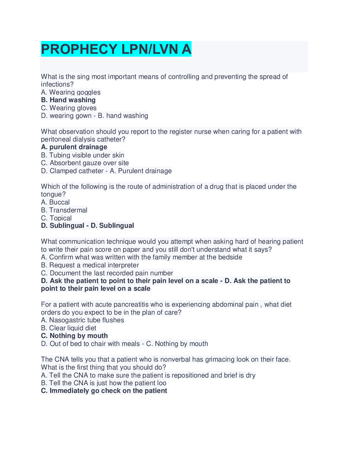 *NURSING > EXAM > PROPHECY LPN/LVN A QUESTIONS AND ANSWERS( WITH COMPLETE BEST SOLUTION RATED A) (All)