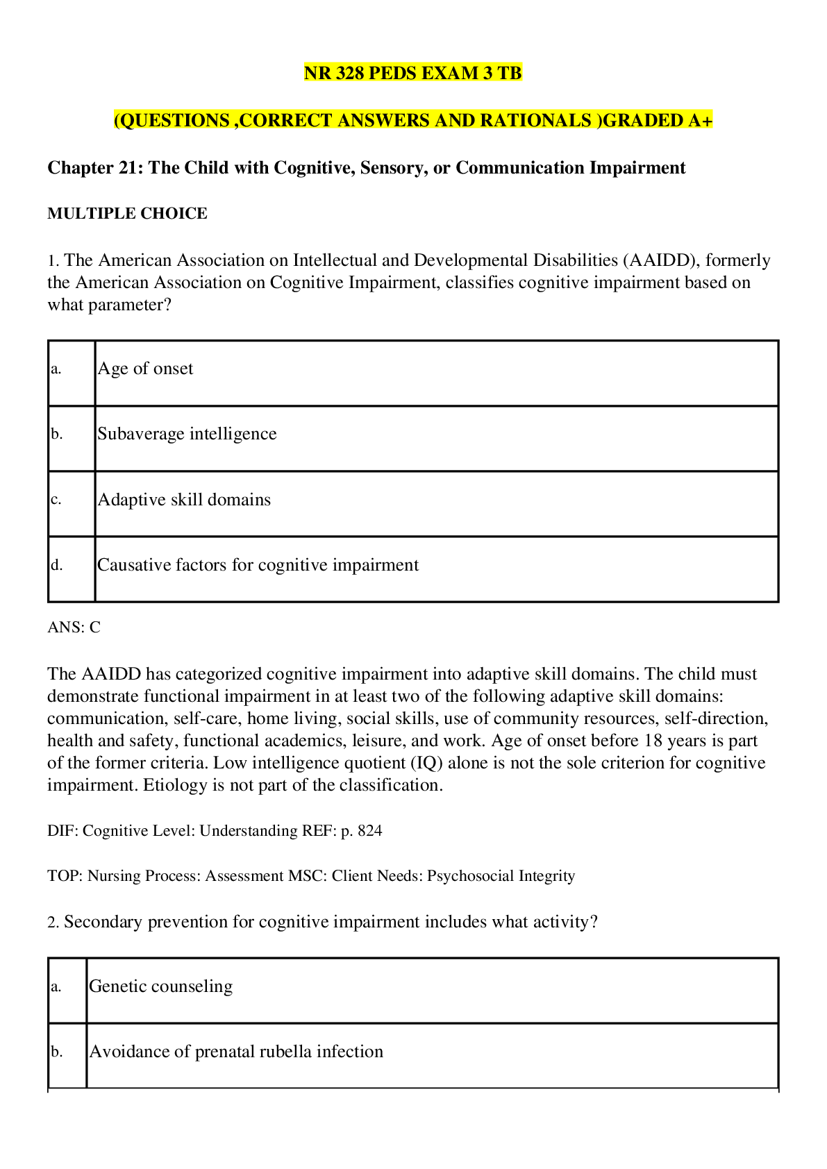 *NURSING > EXAMs > NR 328 PEDS EXAM 3 TB (QUESTIONS ,CORRECT ANSWERS AND RATIONALS )GRADED A+ (All)