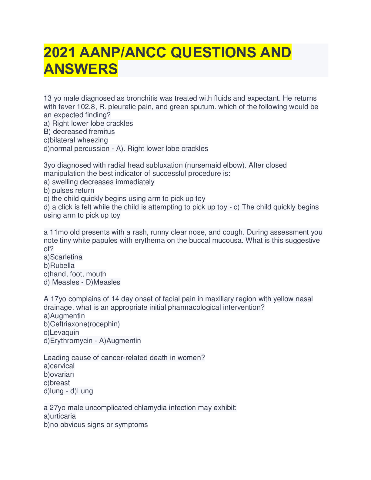 *NURSING > EXAM > 2021 AANP/ANCC QUESTIONS AND ANSWERS( Complete Solution) (All)