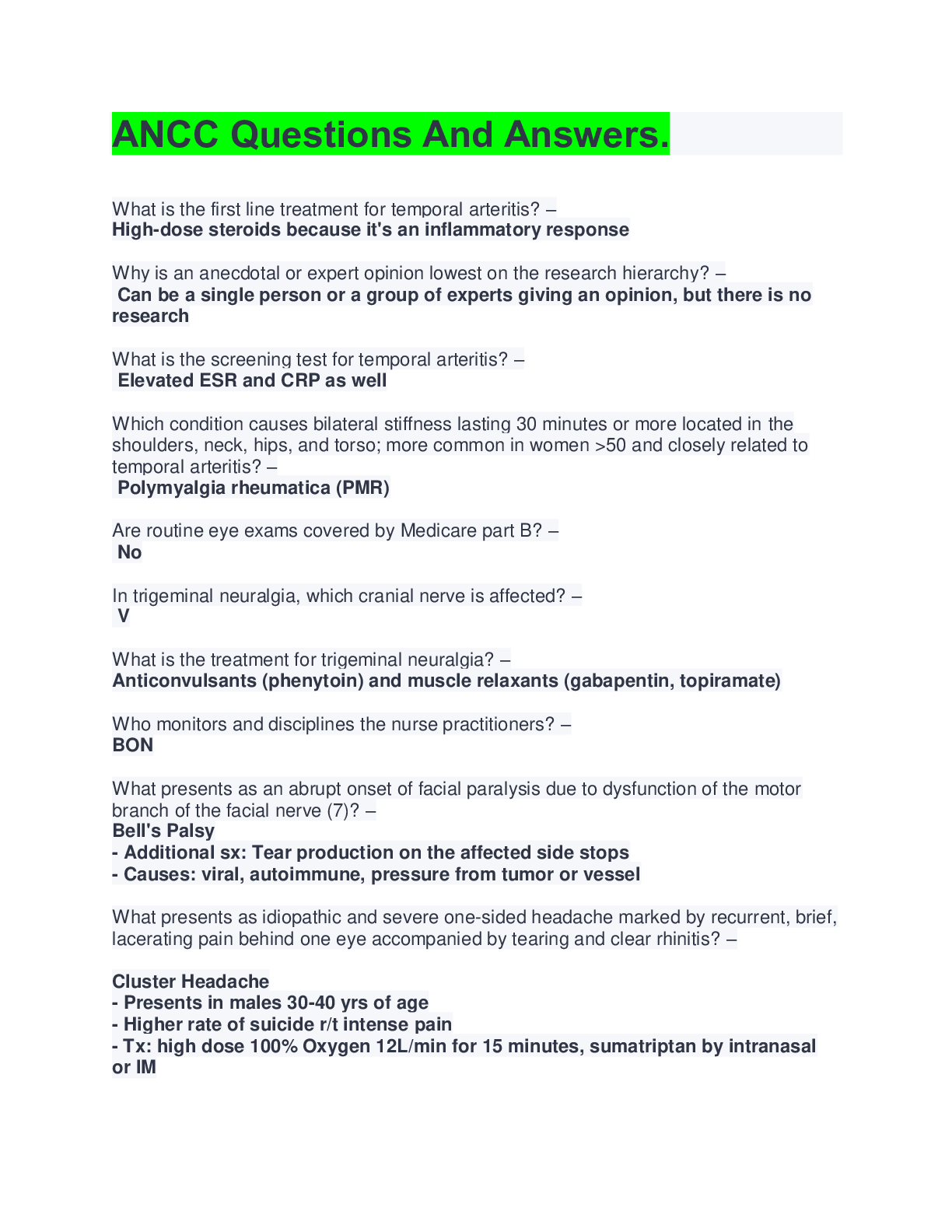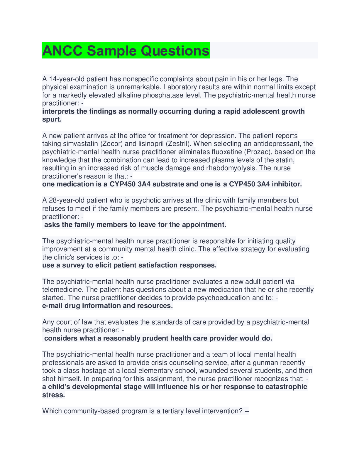 *NURSING > EXAM > ANCC Sample Questions And Answers( Complete top Solution Rated A) (All)