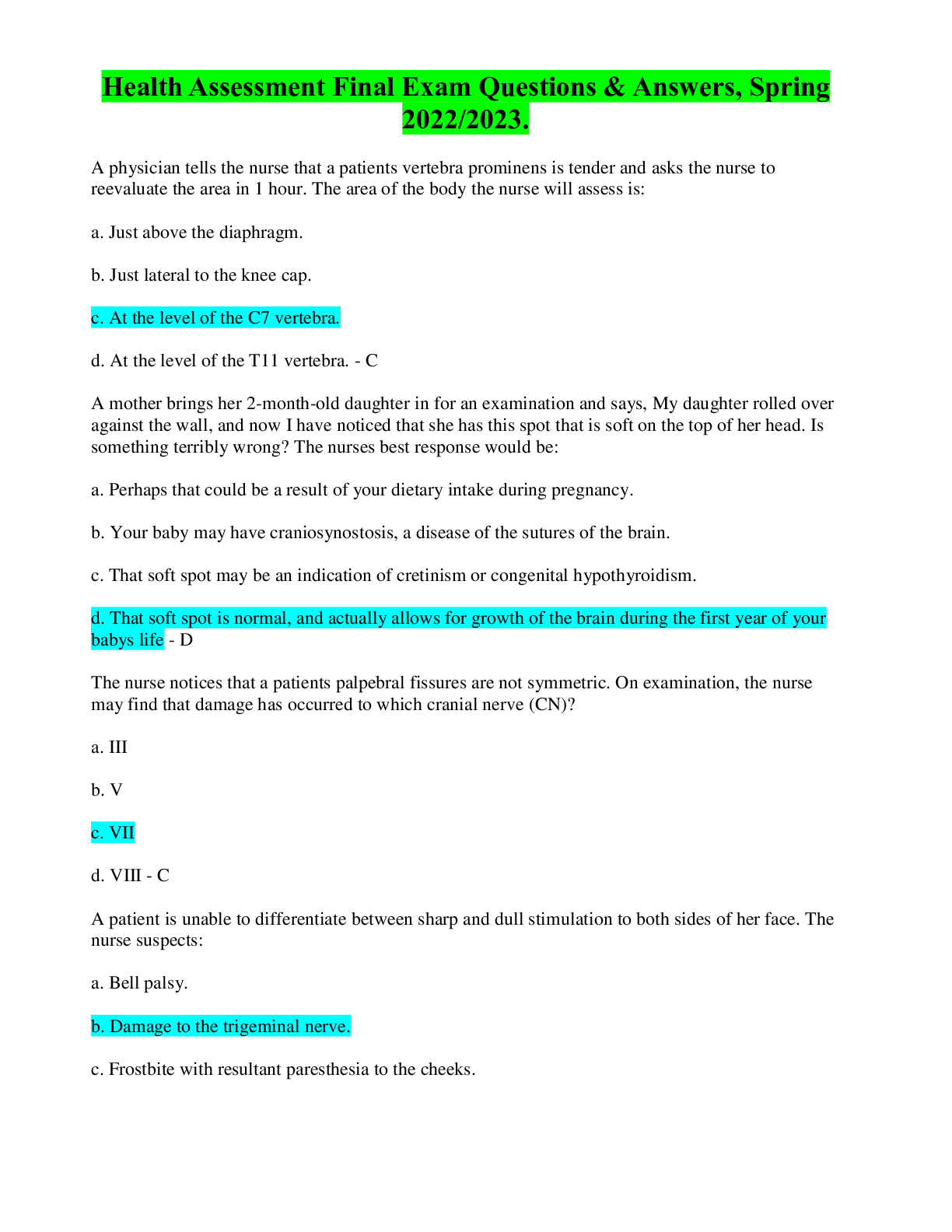 *NURSING > EXAM > Health Assessment Final Exam Questions & Answers, Spring 2022/2023 (All)