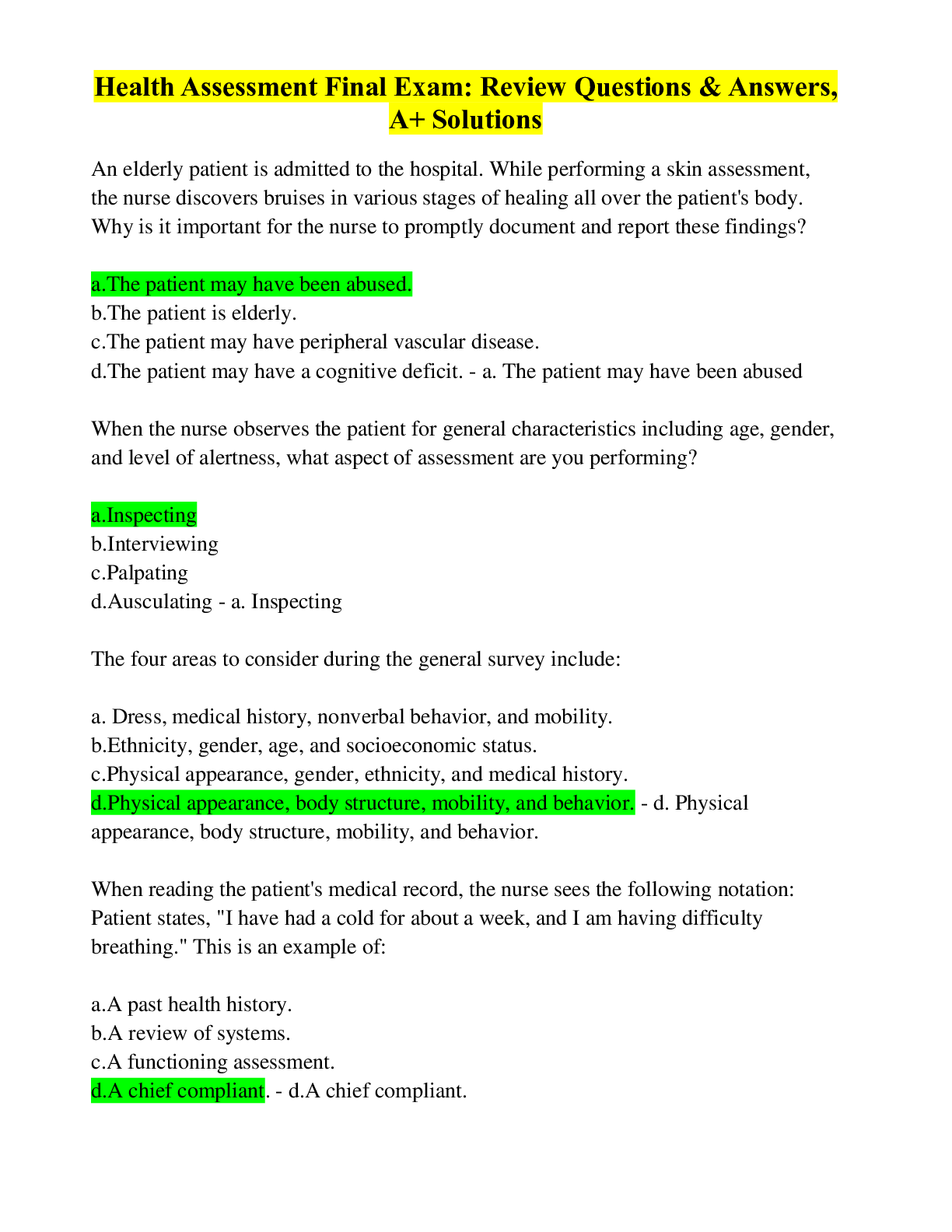 *NURSING > EXAM > Health Assessment Final Exam: Review Questions & Answers, A+ Solutions (All)