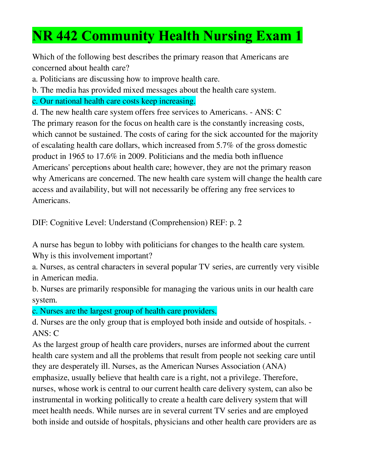 *NURSING > EXAM > NR 442 Community Health Nursing Exam 1(All Questions Answered), Latest Update (All)
