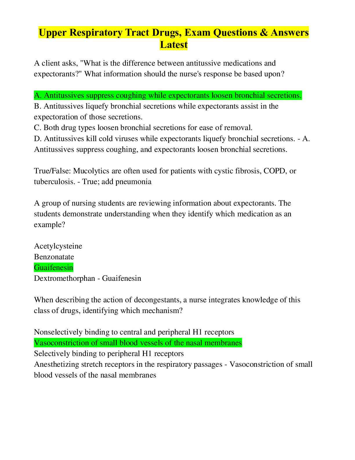*NURSING > EXAM > Upper Respiratory Tract Drugs, Exam Questions & Answers Latest (All)