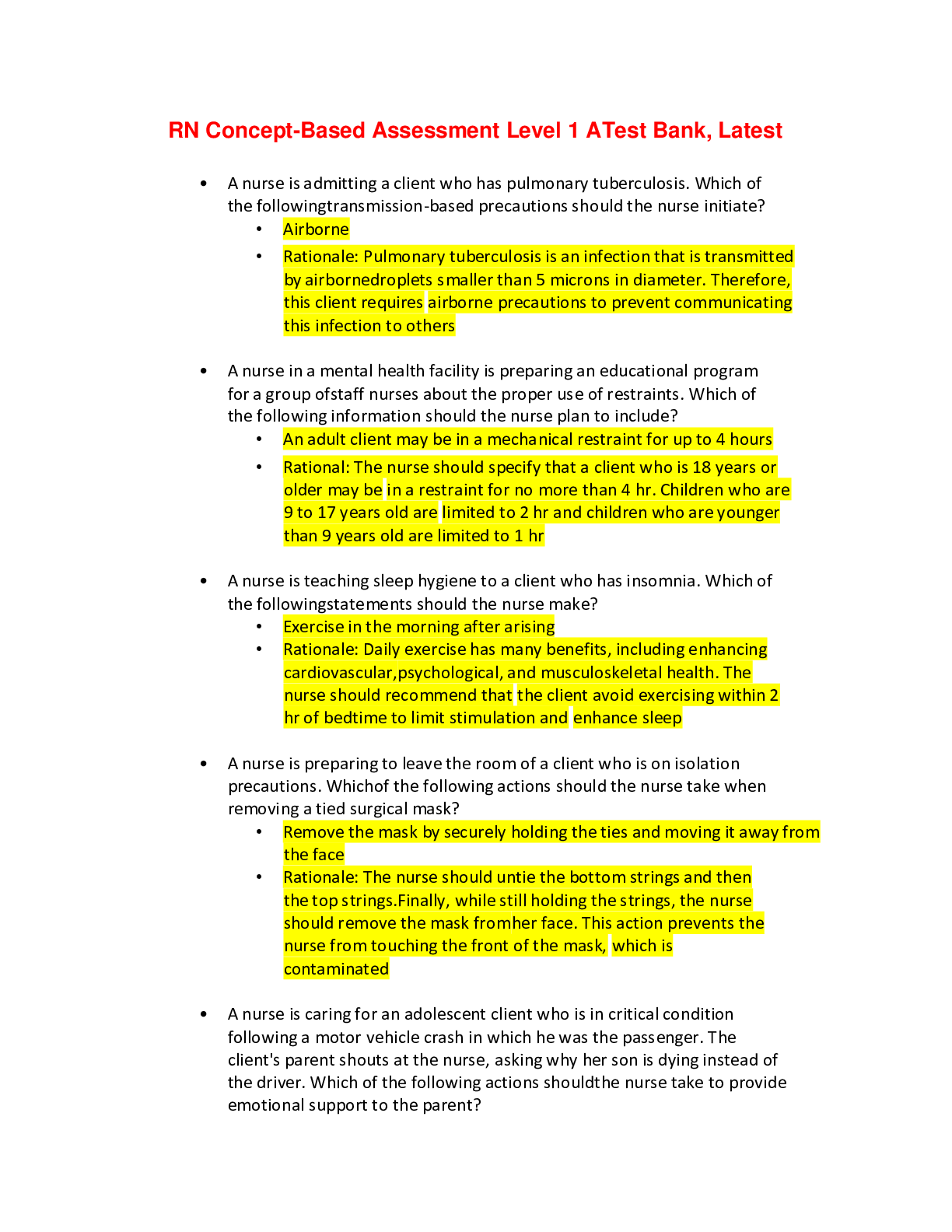 *NURSING > EXAM > RN Concept-Based Assessment Level 1 ATest Bank, Latest Study Guide/ Score A+ (All)
