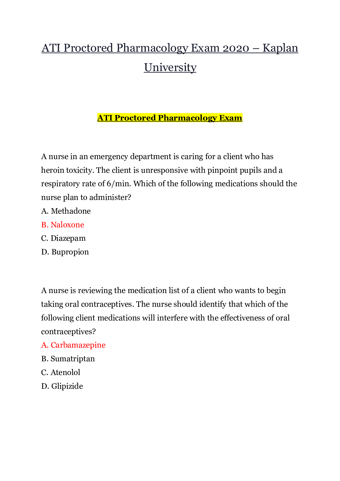 *NURSING > EXAM PROCTORED > ATI Pharmacology Proctored Exam 2020 | Pharmacology ATI _ Graded A (All)