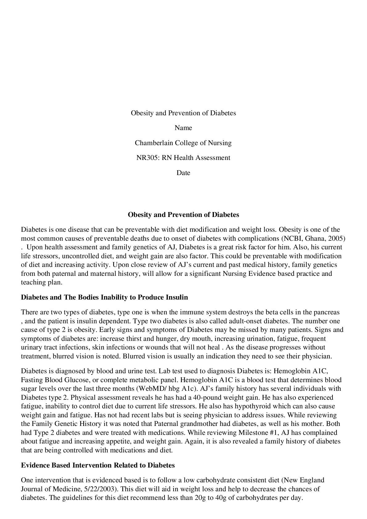 *NURSING > STUDY GUIDE > NR305 RN Health Assessment-Obesity and Prevention of Diabetes:Baum Professional Paper GRADED Chamberlain College of Nursing (All)