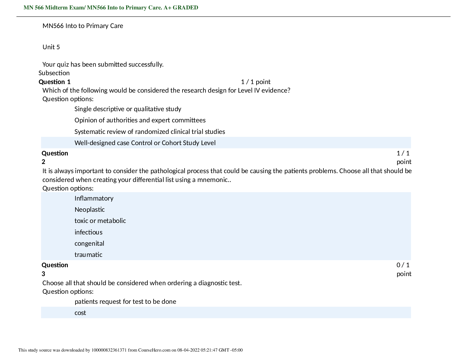 *NURSING > EXAM > MN 566 Midterm Exam, Questions and Answers. Latest 2020. (All)